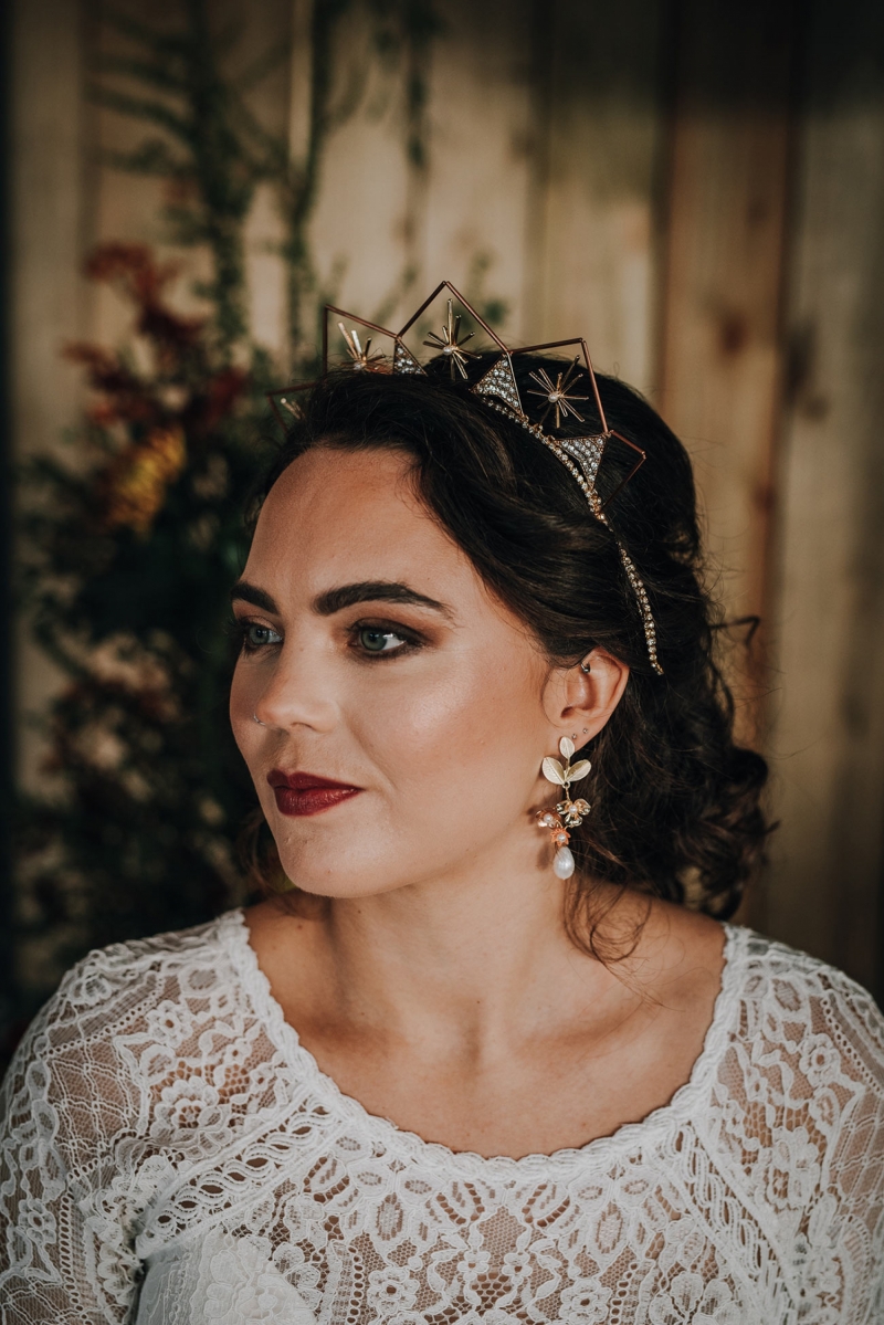 Let's begin with the couple, whose ensembles perfectly capture an essence of pastoral love. The groom's three-piece windowpane suit and light tan brogues evoke on-trend style with its vivid colour and rich texture, while the bride's lace gown combines a sense of whimsy with vintage romance through features including a lace top, scooped sweetheart neckline and elegant long sleeves. Contemporised by a statement headpiece with a geometric design, the look maintains a timeless quality courtesy of make-up with a hint of glamour and gorgeous gold floral earrings finished with a teardrop freshwater pearl.