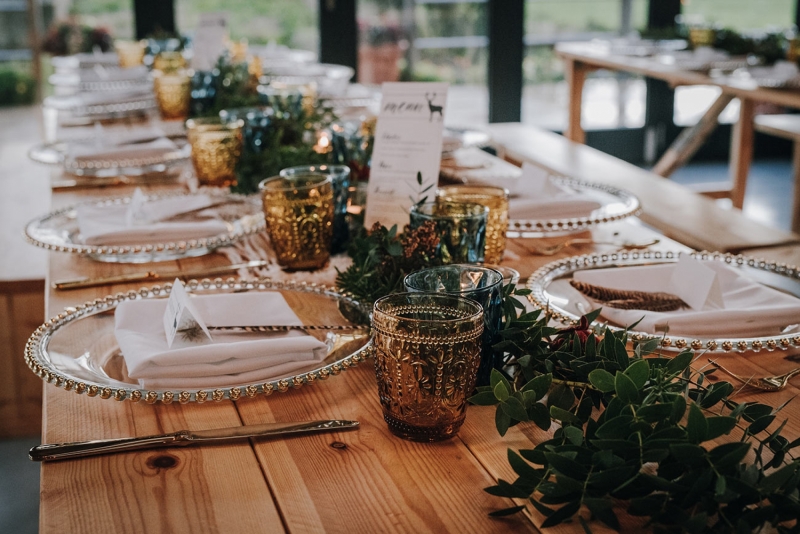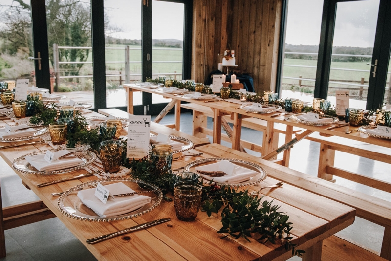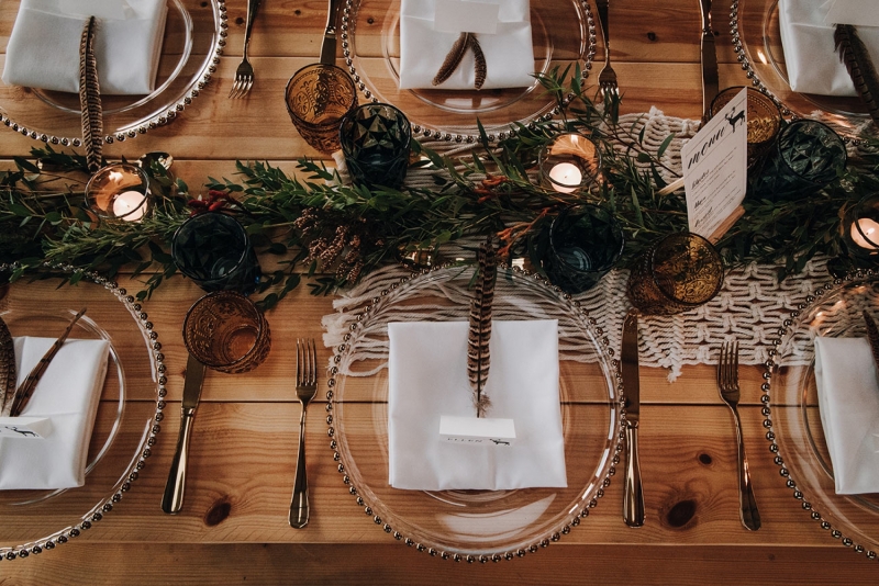 The floral arrangements continue to catch the eye along the tabletops, where trailing greenery is mixed with tea lights, vintage style glassware, and place settings adorned with stag motif place cards and pheasant feathers.