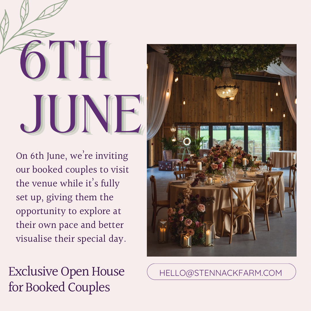 Join the team on Saturday 6th June for an Exclusive Couples Day: a private, invite-only day for their booked couples to see the venue beautifully set up, giving them the opportunity to envision their big day in the space. Then on Sunday 7th June, Stennack Farm’s Open House Wedding Fair will open the venue’s doors to everyone! Explore the venue, gather ideas, and meet an incredible selection of talented wedding suppliers ready to help bring your dream day to life. Whether you're newly engaged or already planning, the team welcomes you to Stennack Farm.