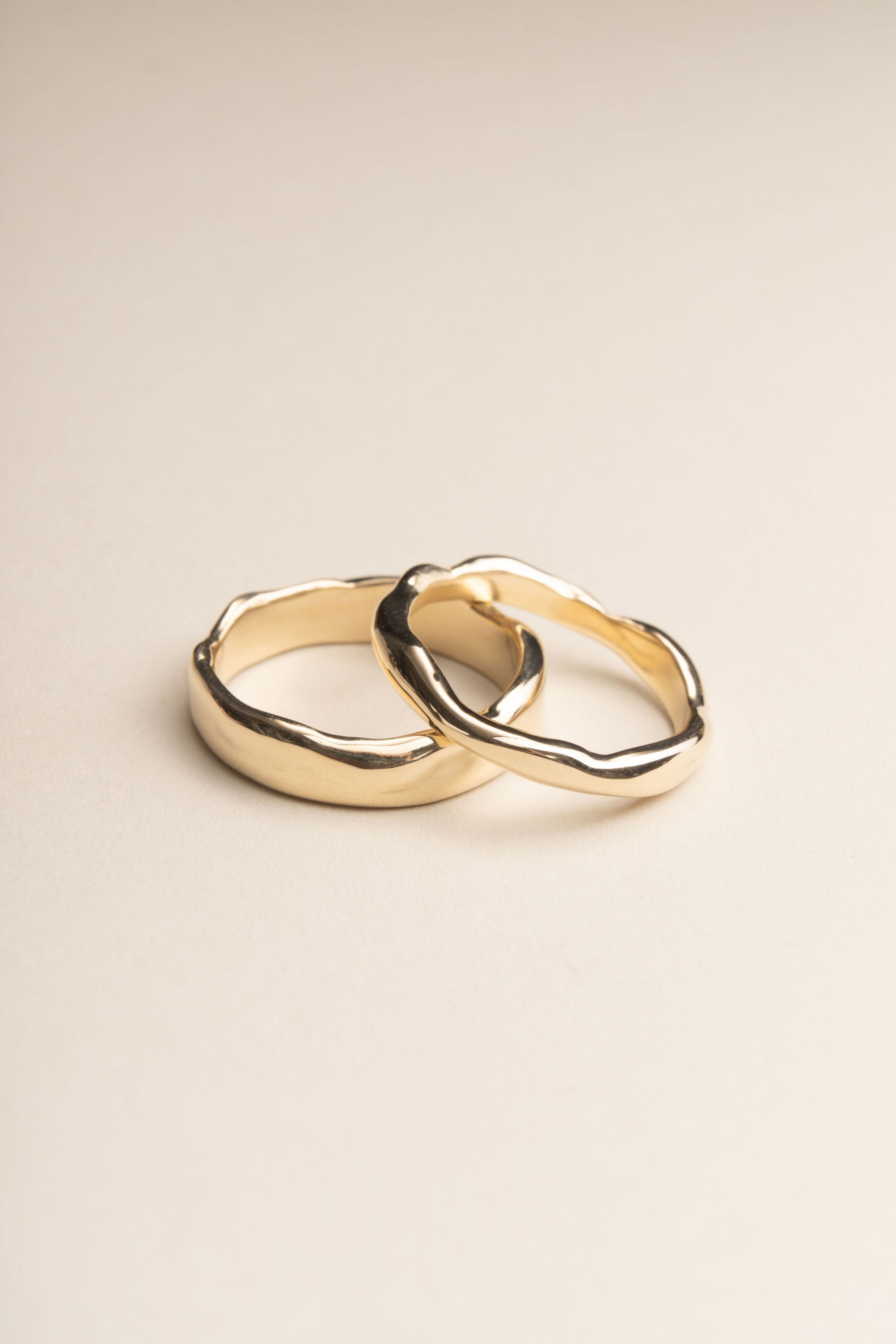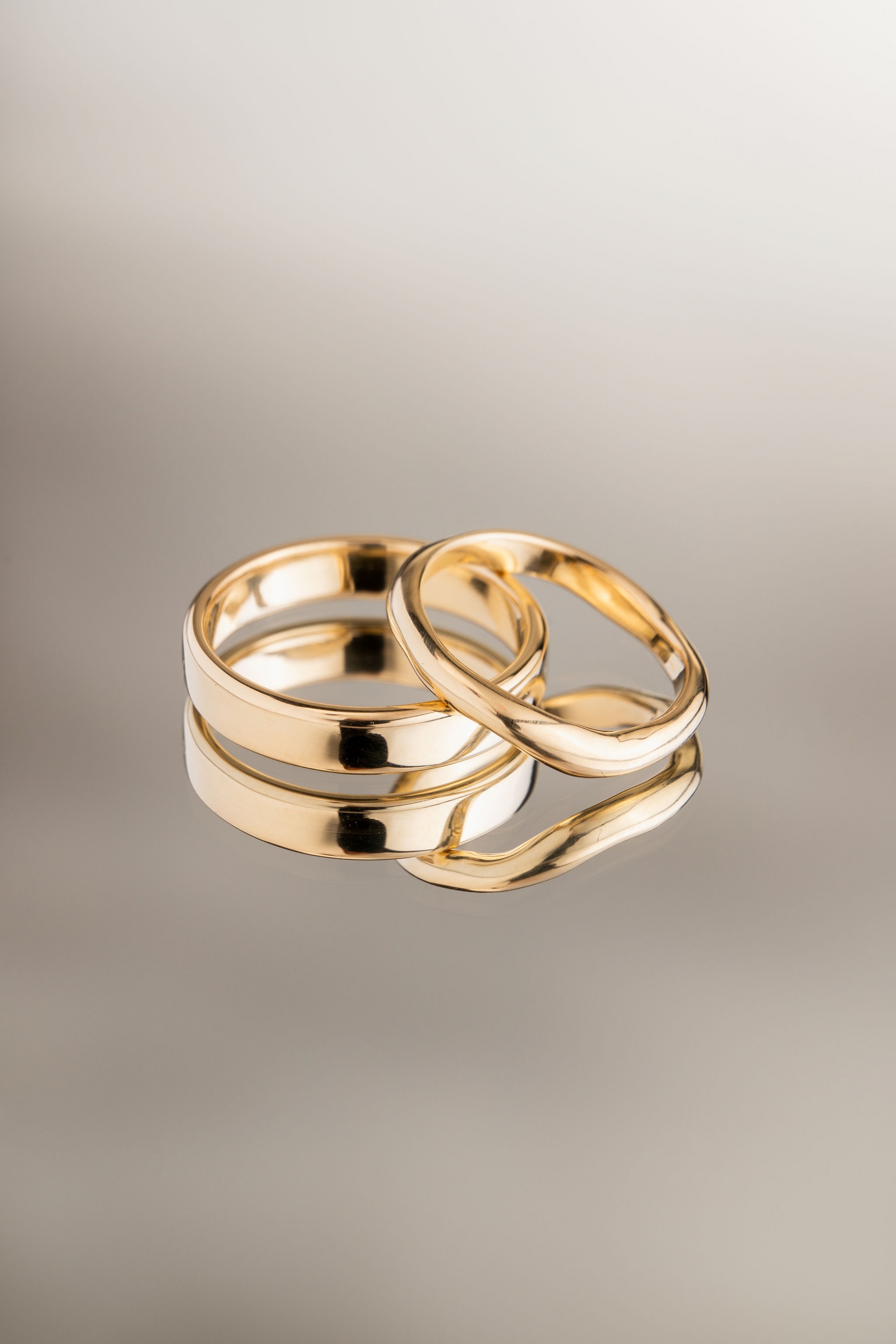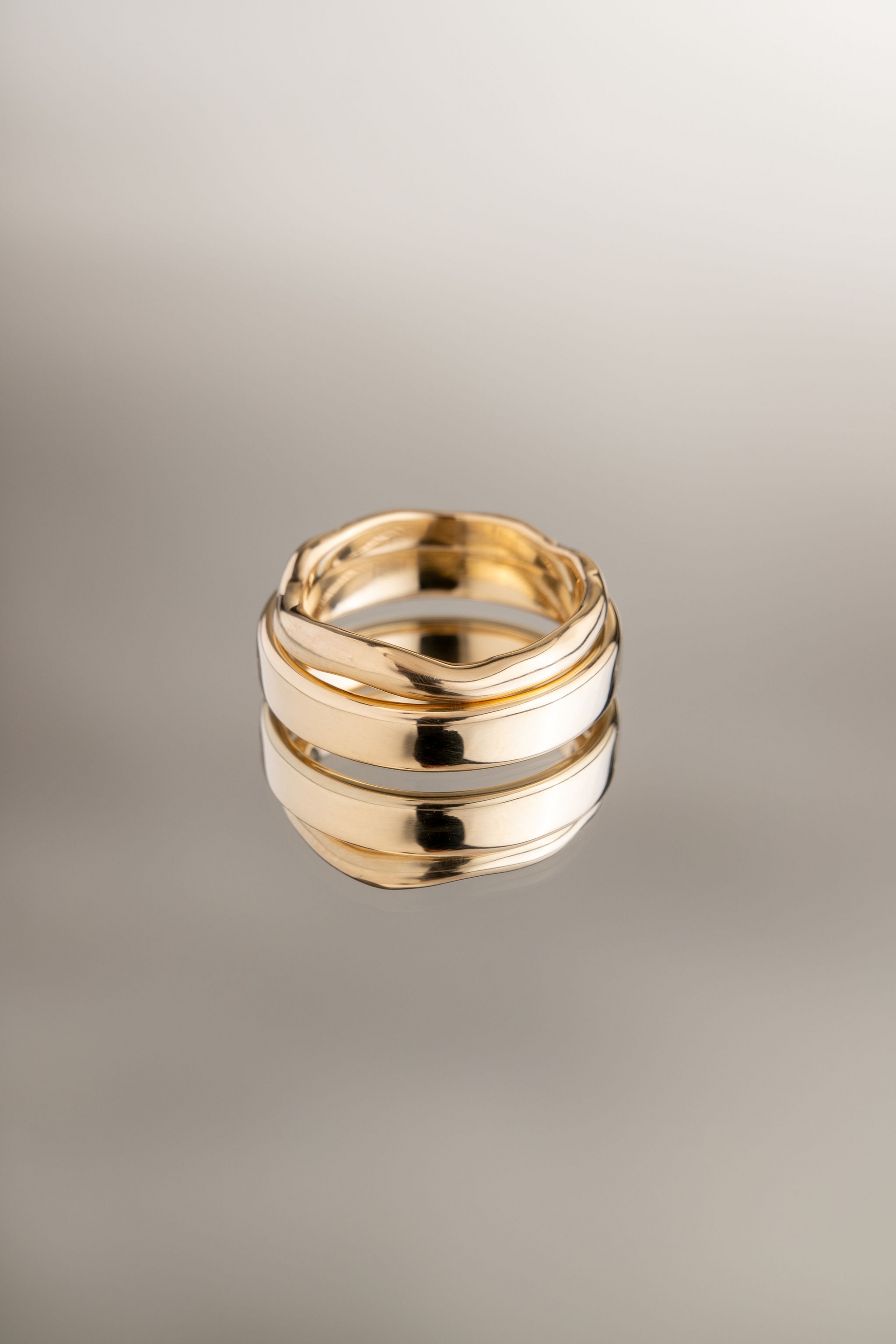 Pick from gorgeous gold or silver tidal, signet, beam, wave, coast or mermaid rings, all of which boast a mirror like shine and feel smoothly sculpted as if sea-worn. Undulating and seductively curved metal evokes the shapes and movement of the sea to represent the couple's connection to the coast and each other while showcasing Naomi's signature style.