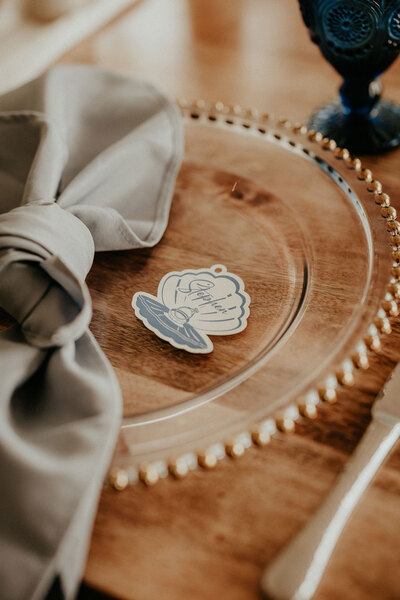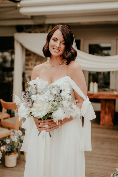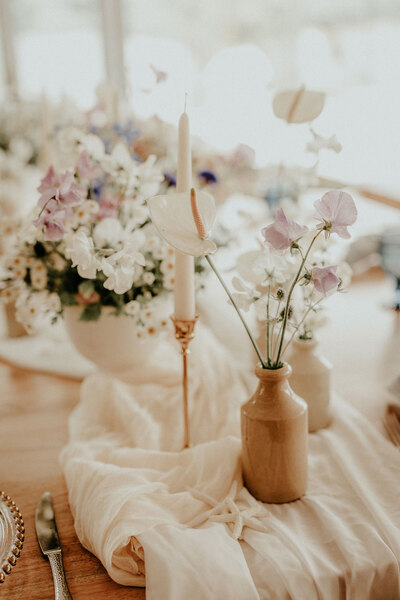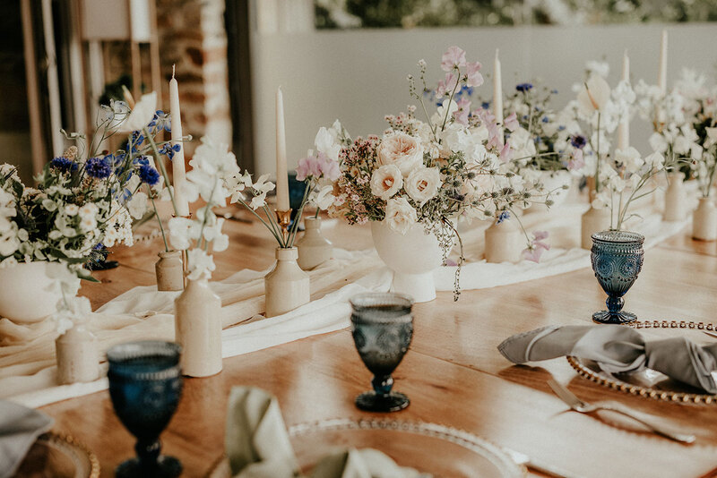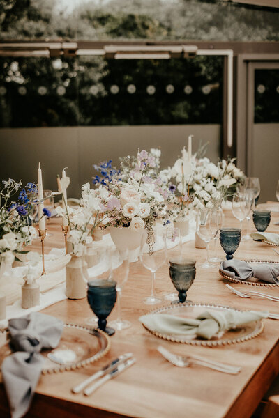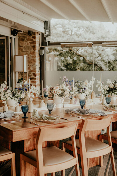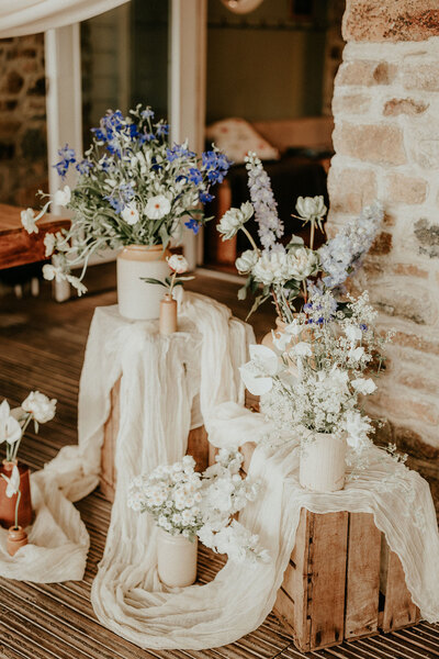 Table styling is an ode to coastal beauty: organic clusters of white and lilac blooms mingle with sea thistles in soft urns and earthenware vessels. Blue glassware and delicate accents of starfish and shells offer subtle nods to the ocean, while golden touches add a whisper of luxe. Soft, flowing linens complete the look, bringing a relaxed elegance that echoes the ocean beyond.