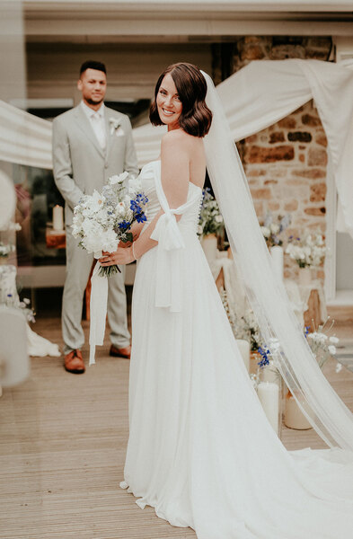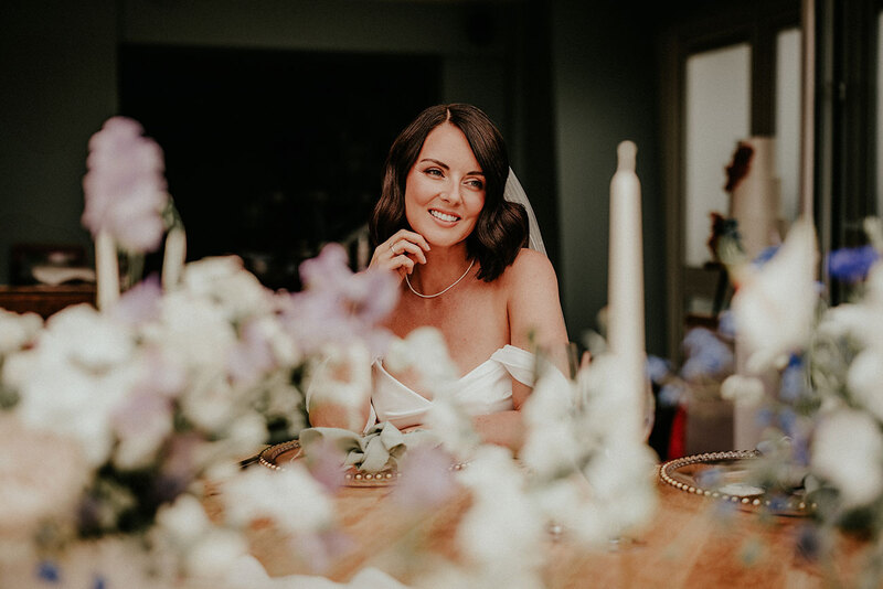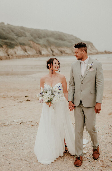 The bride floats in a whimsical gown paired with delicate jewellery, her look perfectly echoing the light, airy setting. The groom’s soft sand-toned suit blends seamlessly with the natural coastal palette. A vintage campervan adds a playful twist – doubling as stylish transport and a fun focal point for this secluded, seaside celebration on Cornwall’s south coast.