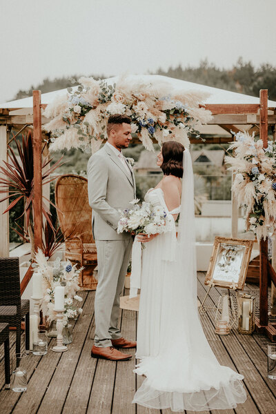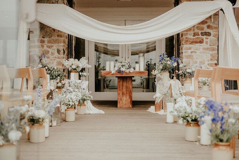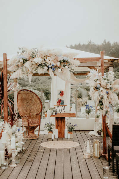 This styled shoot showcases the dreamy potential of a wedding here. “We styled two ceremony looks – one took a fresh garden theme with abundant flowers, and the other with boho touches like pampas grass, lanterns and a statement peacock chair,” shares stylist Victoria Wesson.