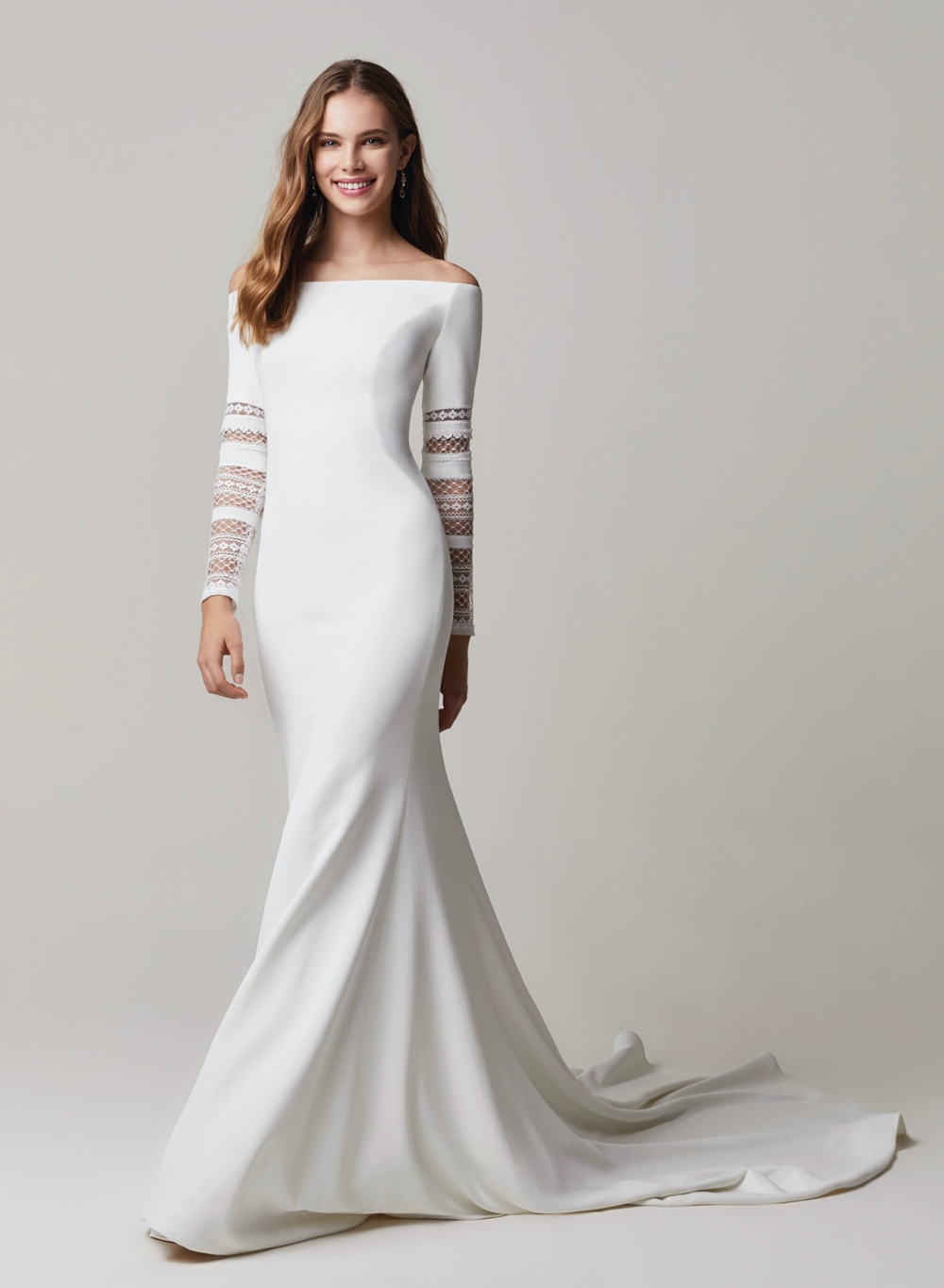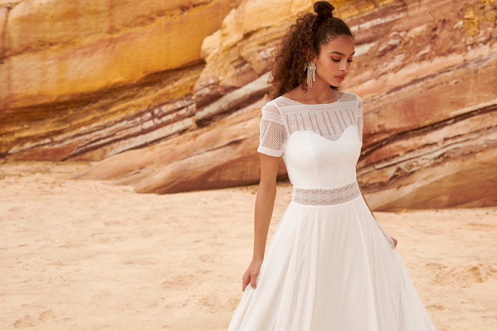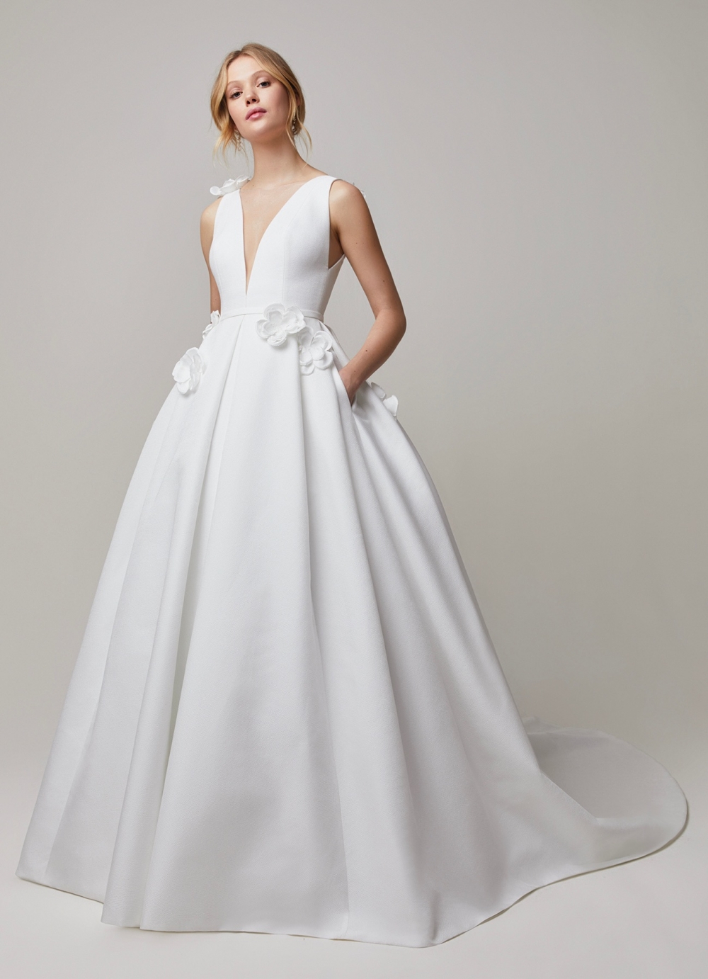 While still channelling its boho luxe style and minimalist romance all with a high fashion finish, expect ecological mikado taffeta cut into jaw-dropping A-lines alongside dreamy tulle, curve-hugging crepe, caviar beading, embroidered Chantilly lace, and sheer and satin organza.