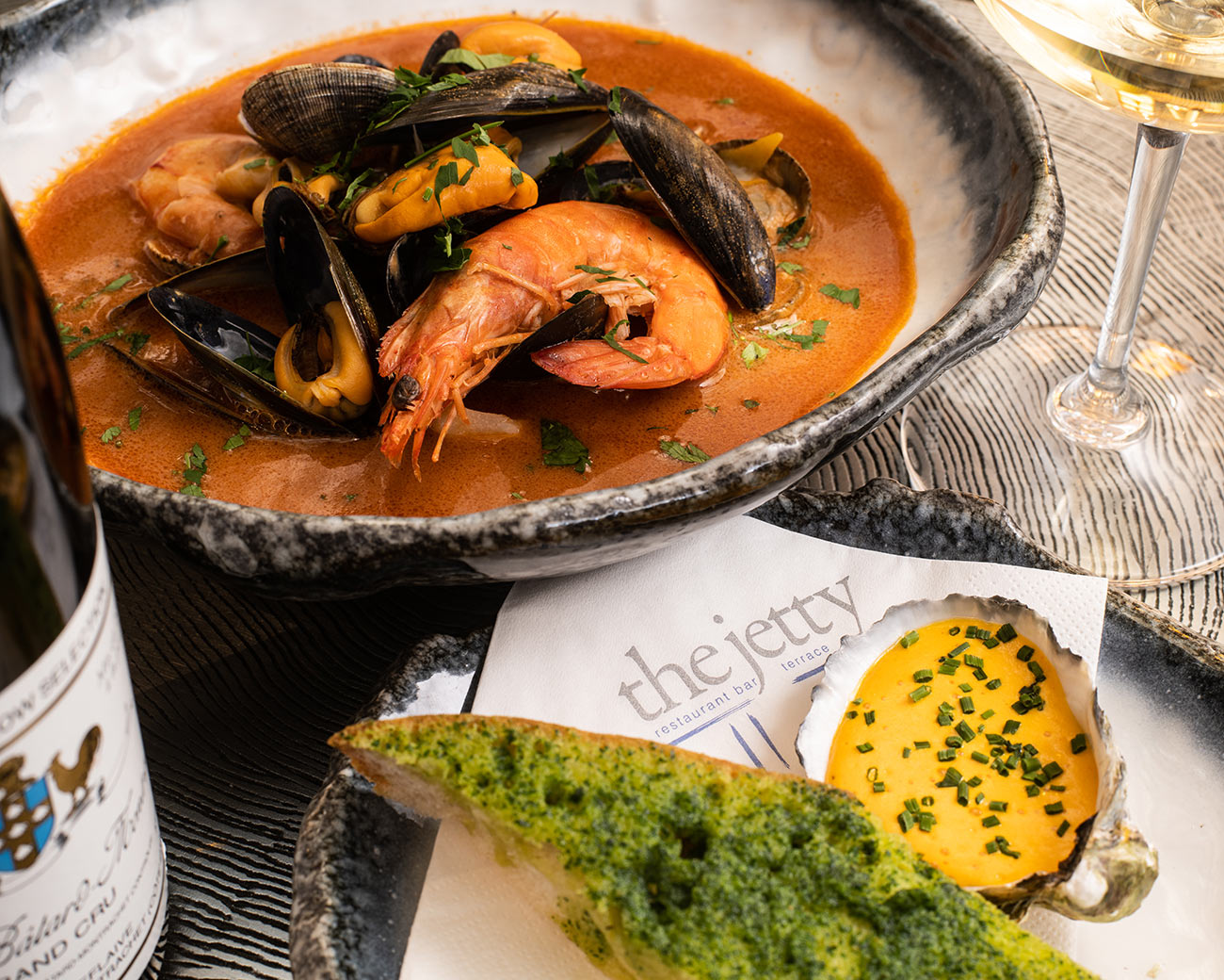 Signature dishes crafted by chef Alex Aitken include innovative creations such as cockle popcorn, Alex's twice-baked cheese soufflé, cod & crab, The Jetty surf & turf and roasted monkfish. These dishes showcase Aitken’s flair for combining simple ingredients with bold, coastal flavours.