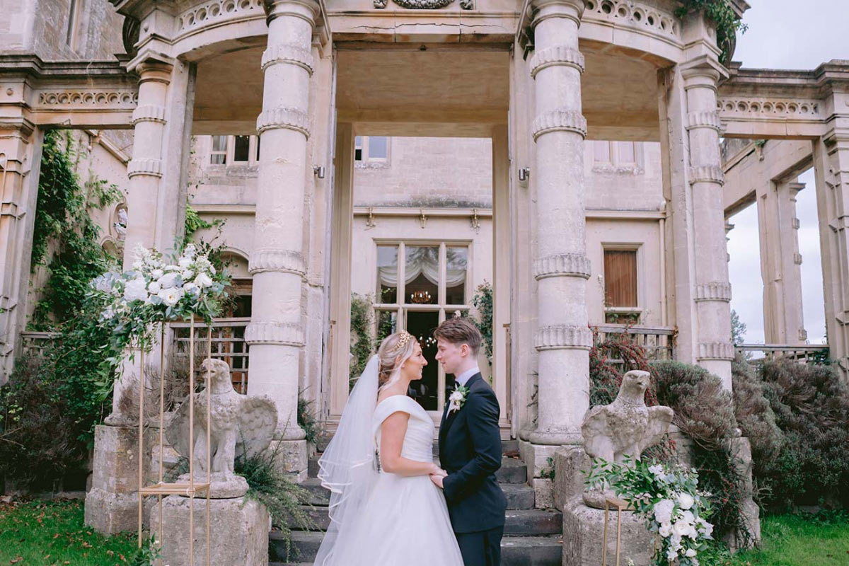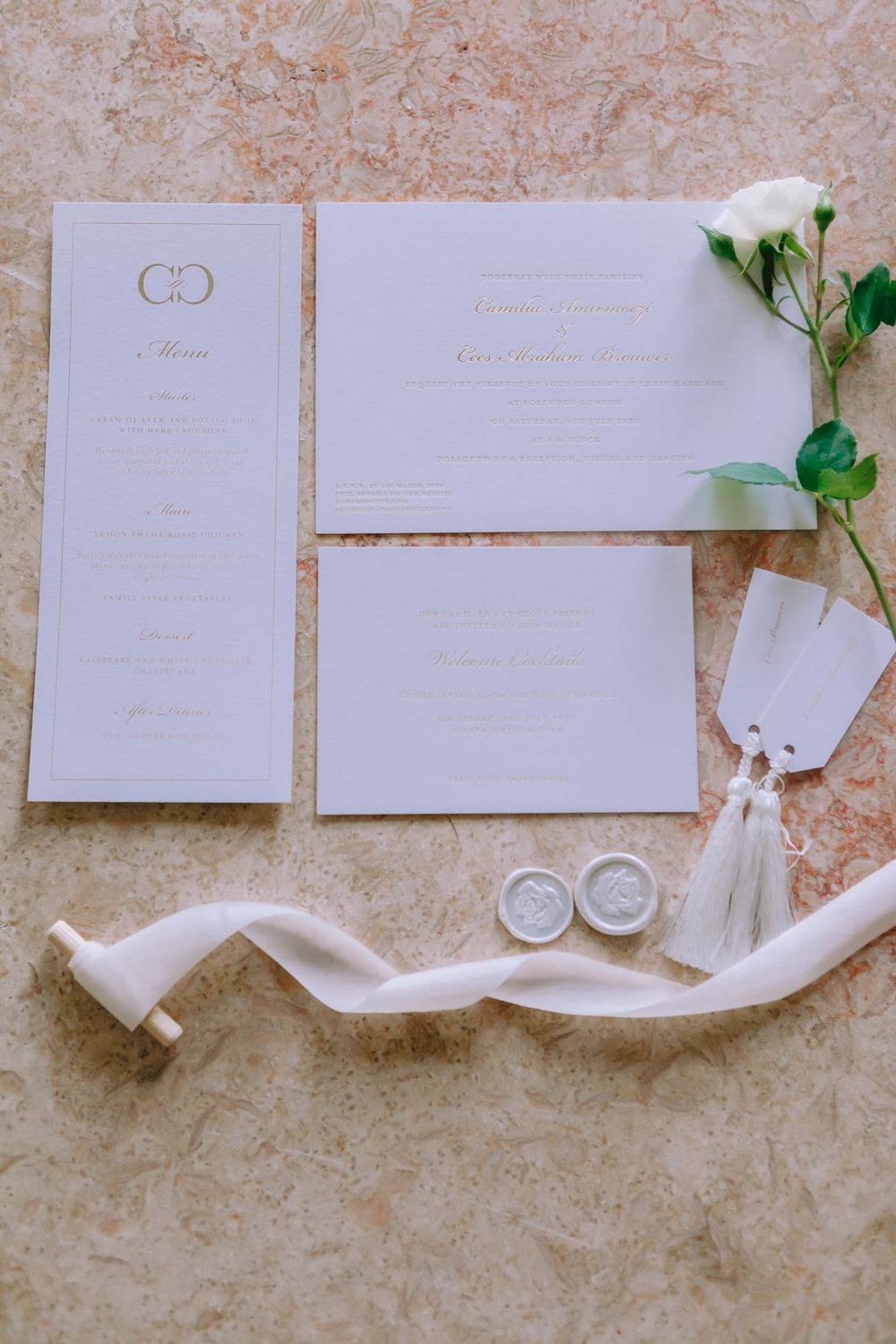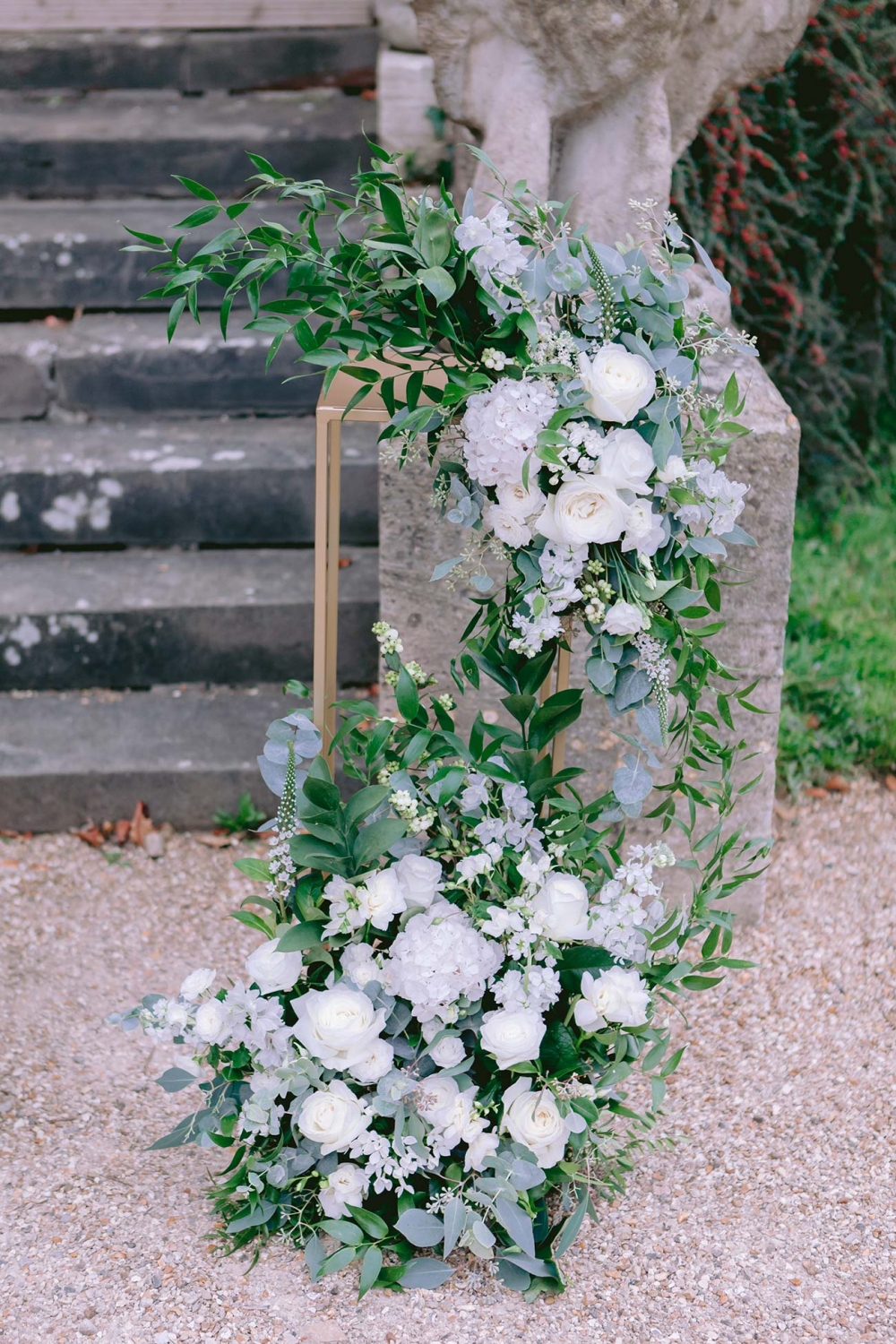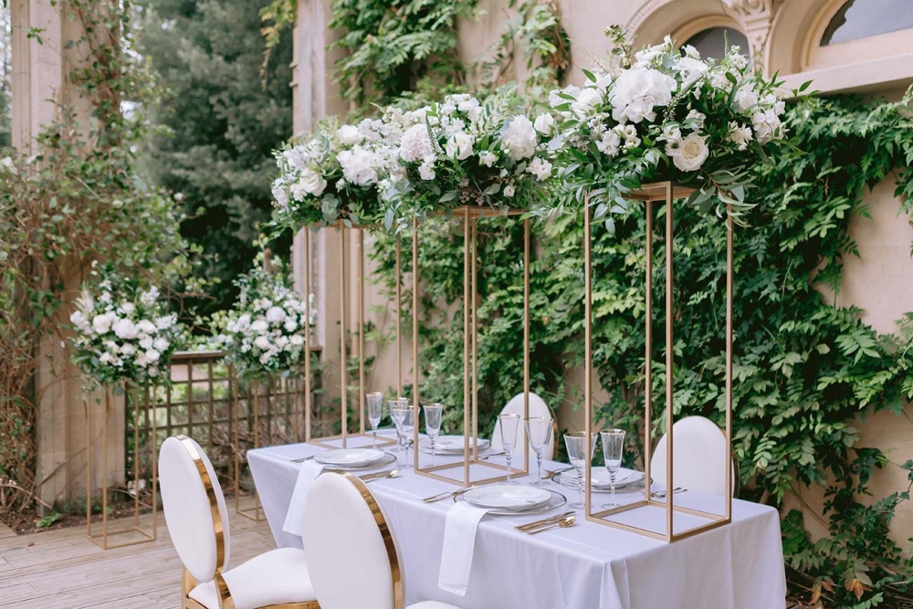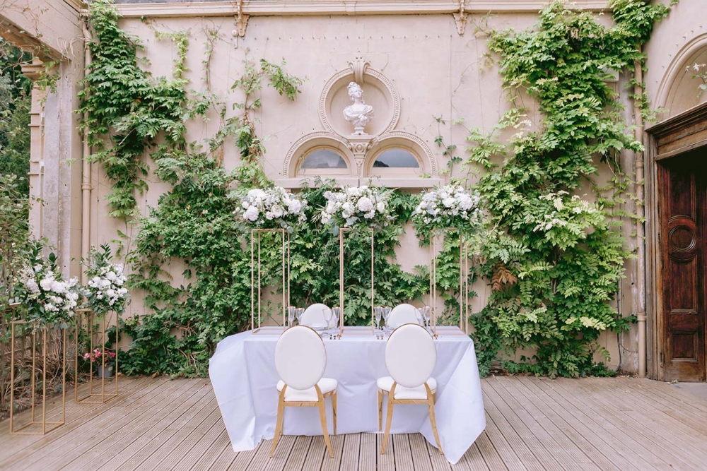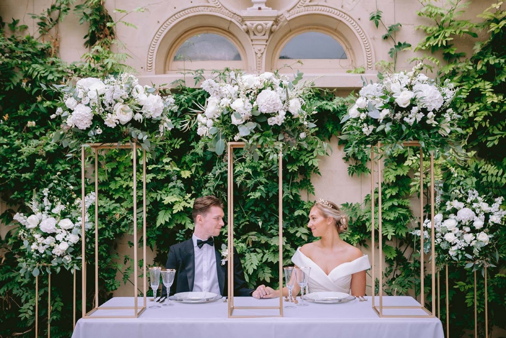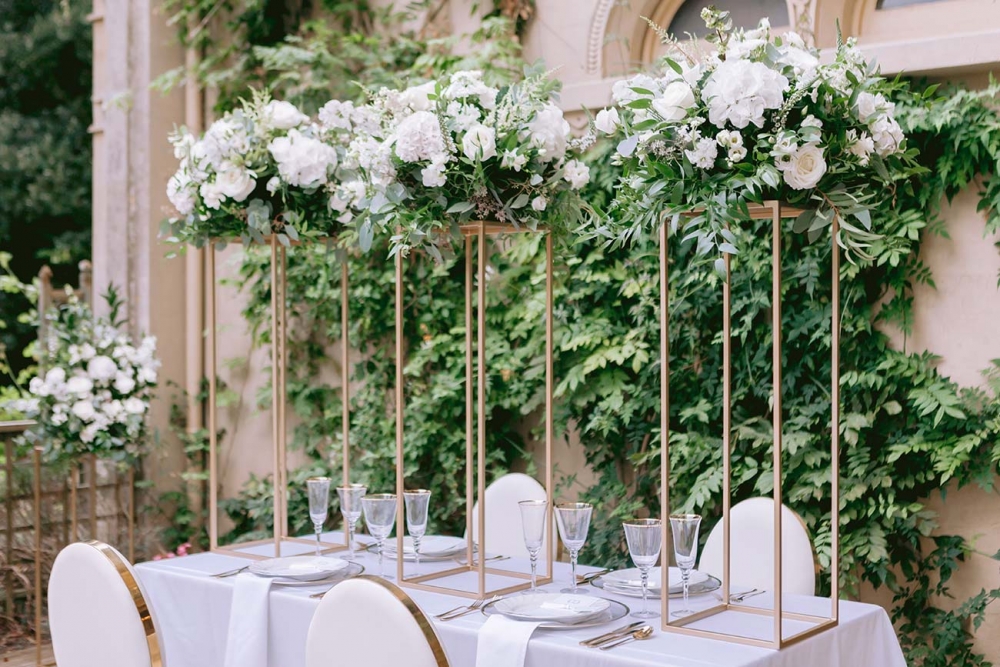 A stationery suite featuring gold foil, calligraphy and bespoke wax seals sets the elegant tone, while the floral installations ' luscious clusters of white signature roses and hydrangeas sitting upon tall gold stands ' makes for a luxurious and captivating tablescape against the historic, foliage-cloaked walls of the stately home. 'White plates were paired with gold cutlery and gold-rimmed glassware which looked striking against the simplicity of the crisp white linen,' says Jen.