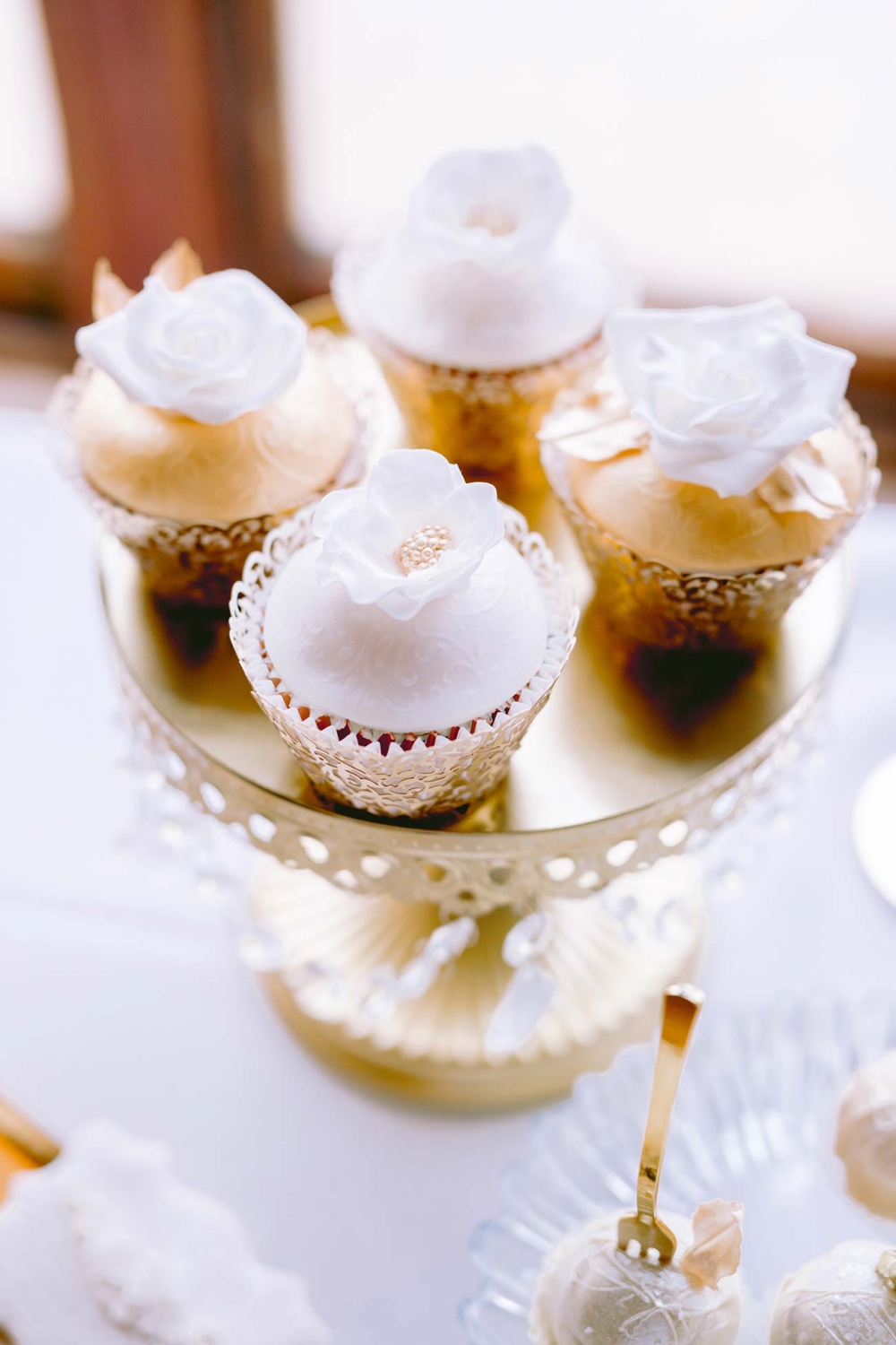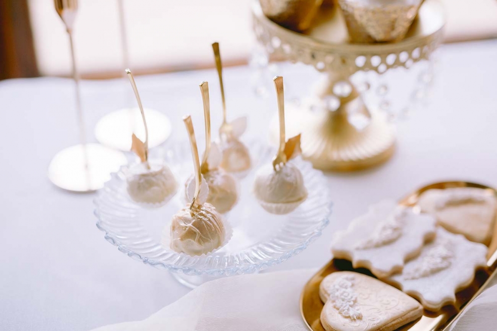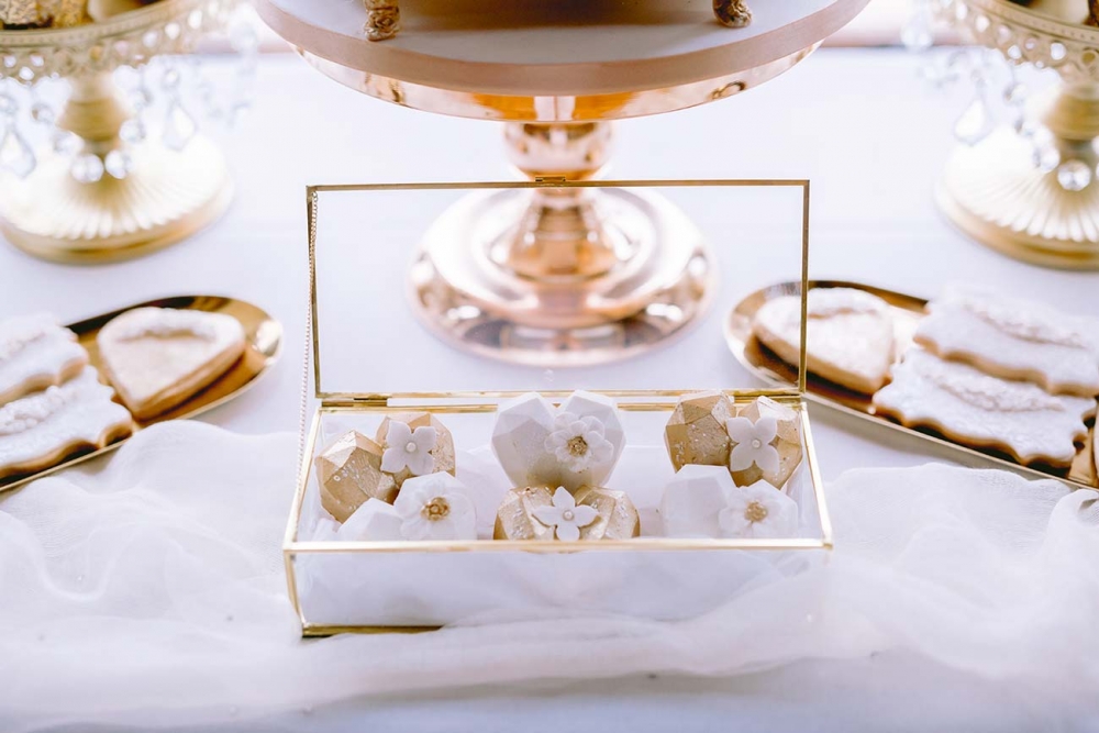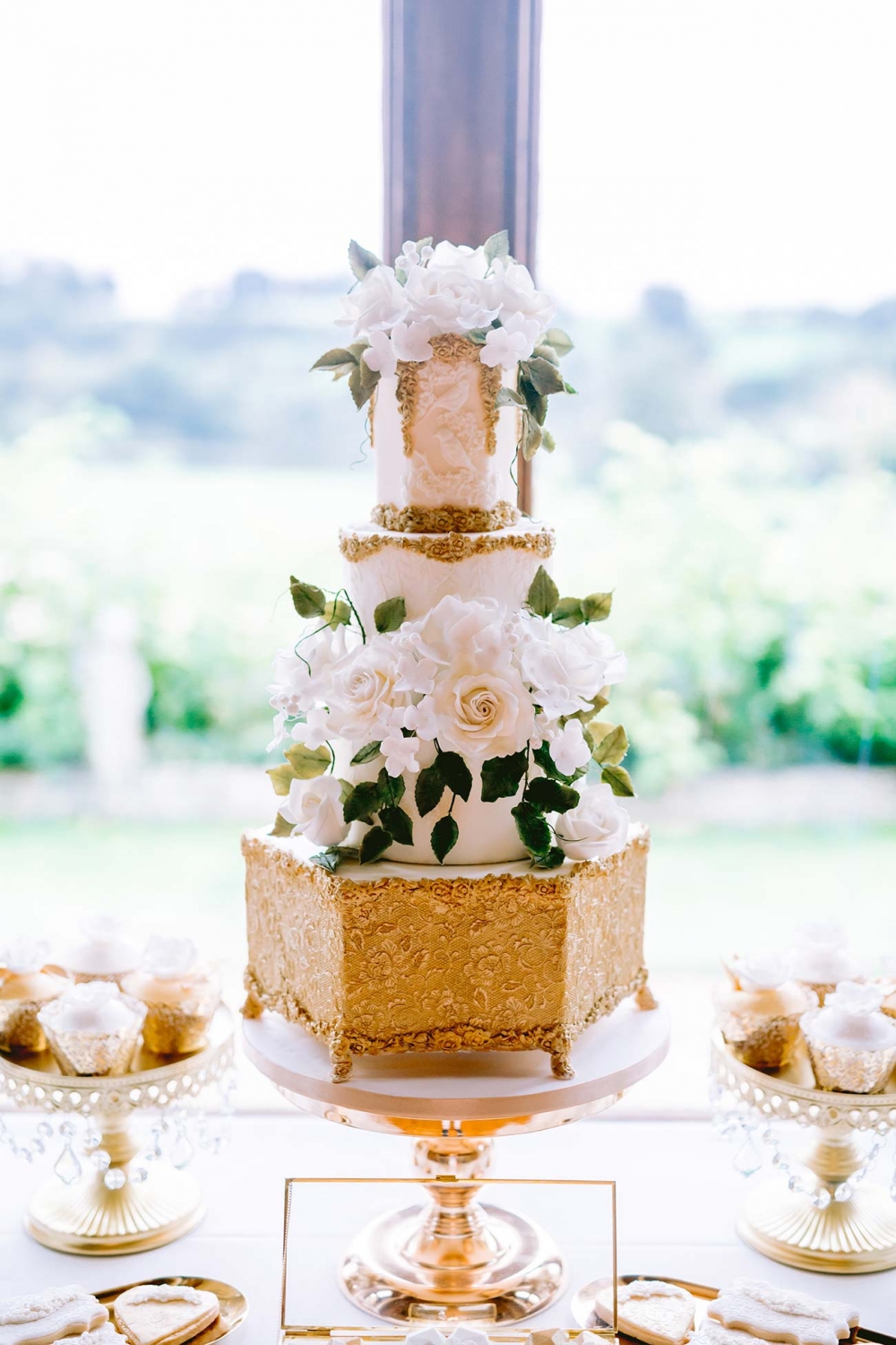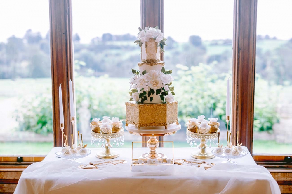 Echoing the splendour and palette, the cake is an intricate vision of gold leaf and exquisite floral and lace detailing, displayed alongside a variety of delectable and finely crafted sweet delights, from cake pops to iced cookies.