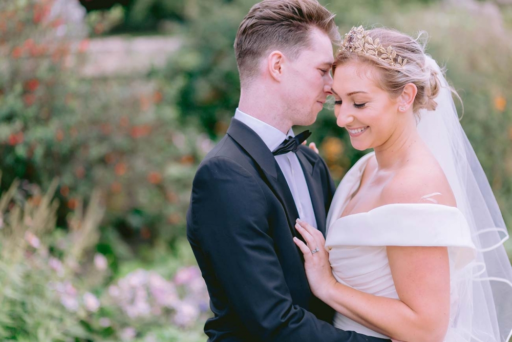 Such luxe styling demands a special dress ' and, accessorised with a bespoke, handcrafted gold crown, this shoulder-skimming ivory ball gown evokes a sense of regal romance with a modern twist. The groom's classic black-tie ensemble perfectly complements the elegant and enduring appeal of this timelessly luxe aesthetic.