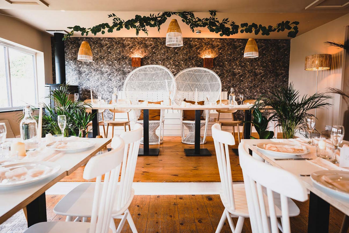 Set within stone-hurling distance of the water's edge, the newly renovated wedding event space is the perfect fusion of barefoot and rustic, inviting the outdoors in to stunning effect. Bathed in natural light while framing the seascape, the décor blends a palette of ocean blues and sandy shades spliced with leafy green plants, plush soft furnishings and a log burner, making for a light and airy setting in the warmer months and a cosy and atmospheric space in the depths of winter.