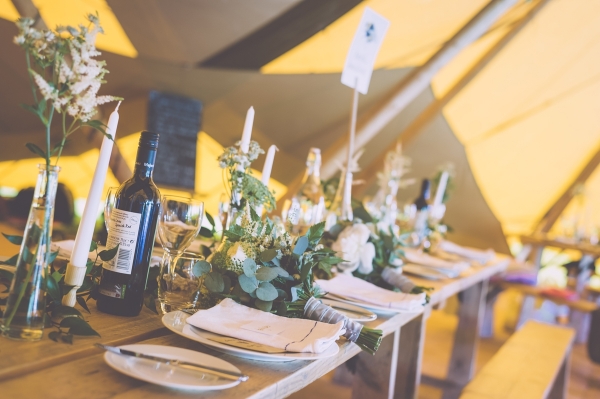 'We hand-turned more than 50 candlestick holders, made firepits from farm oil drums, made outdoor games, a wigwam entrance, chalkboards, direction and welcome signs, a cider barrel for a cake table, and rustic benches and feast tables,' says Bryd'.