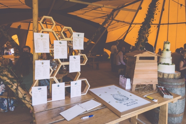 With Bryd' affectionately called 'Bee' by Chris, the couple's shared passion for nature and saving bees made a fitting theme for the day, with features such as beehive postboxes for cards, a bee thumb print guest book, and honeycomb table plan alongside a host of other handmade d'cor.
