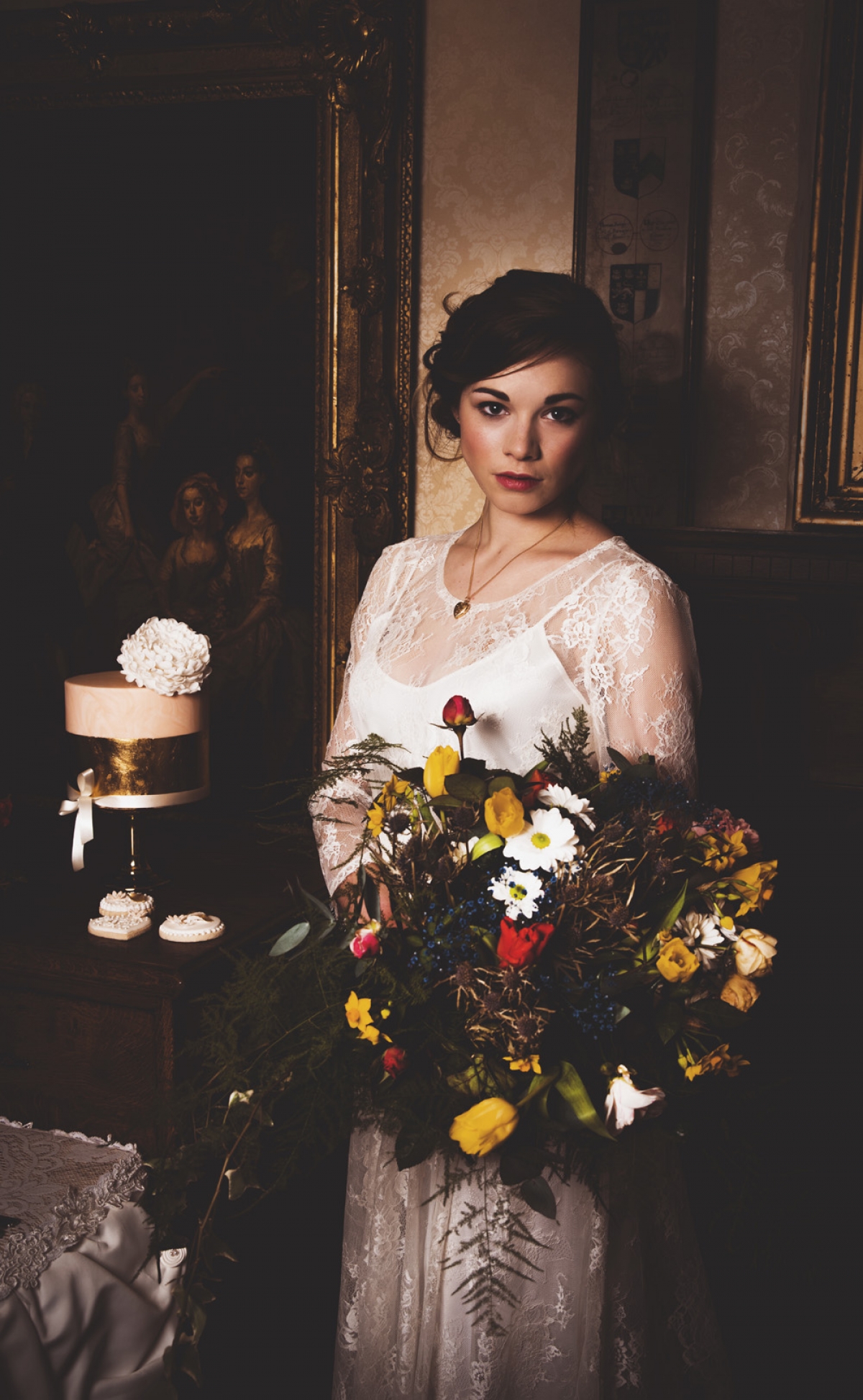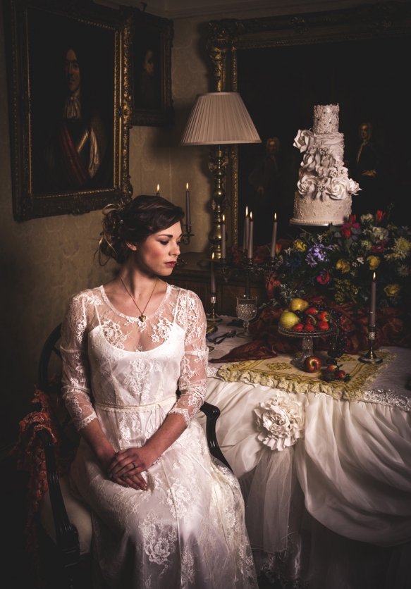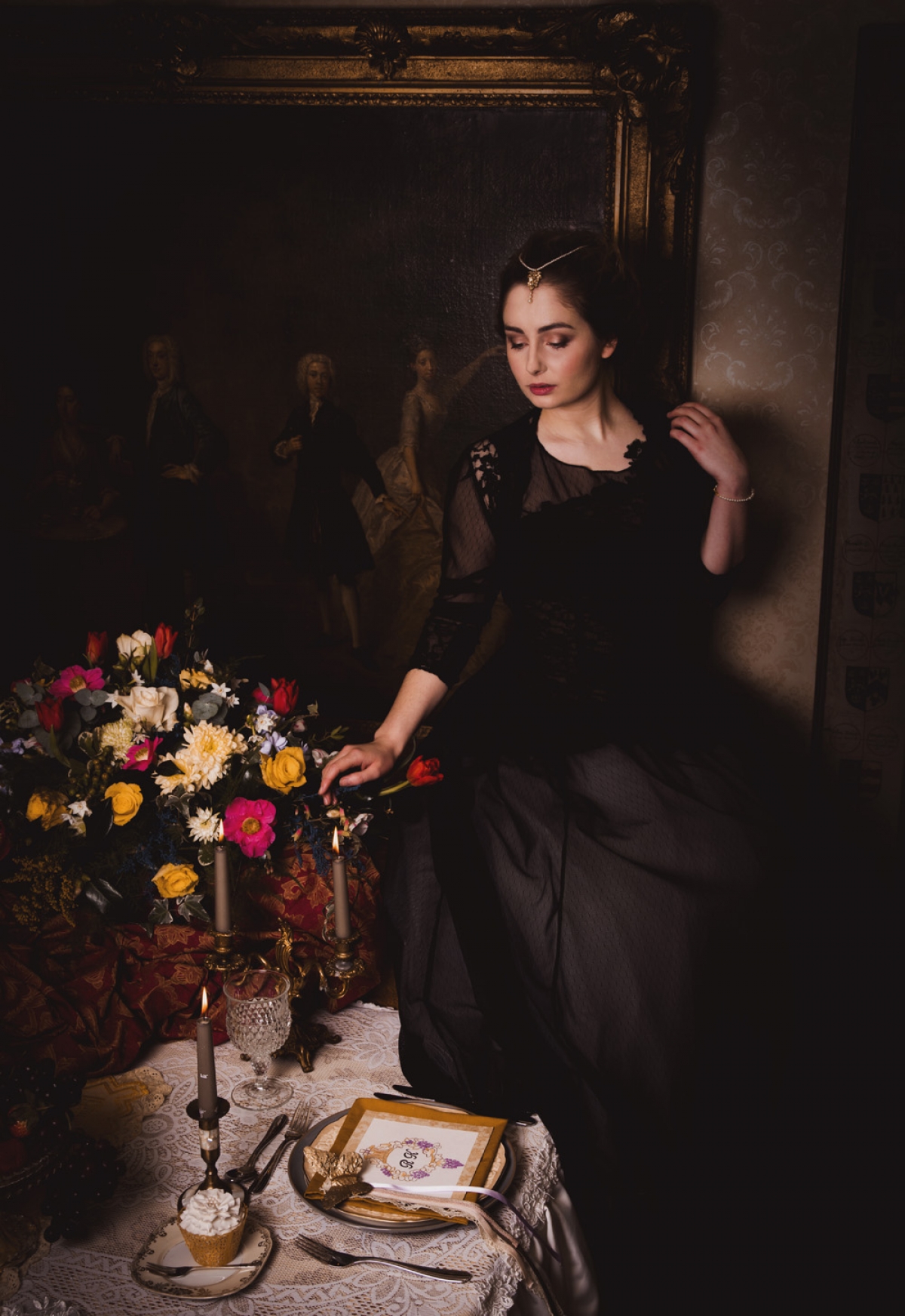 A team of wedding suppliers joined forces to create this beautiful styled shoot. An opulent 17th century mood meets a Gothic edge in the striking imagery; decadent details carry through the look, from rich toned floristry, eye-catching jewels and glamorous cakes, to distinctive make-up and hair beautifully accessorised with vintage pearls. Rich in ambience and romance, it creates a look that is as covetable as it is captivating. The embellished bridal gowns and Victoriana black number add oodles of fashion-forward flair - for a wedding day replete with the wow factor.
