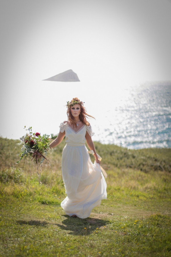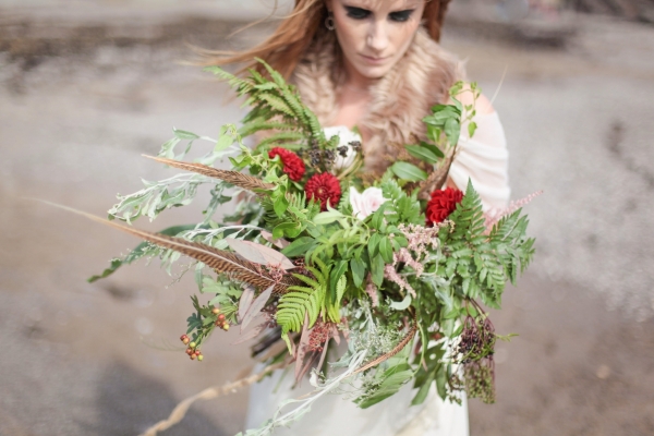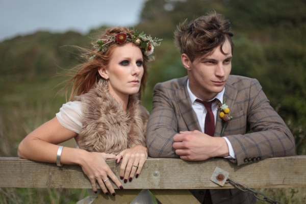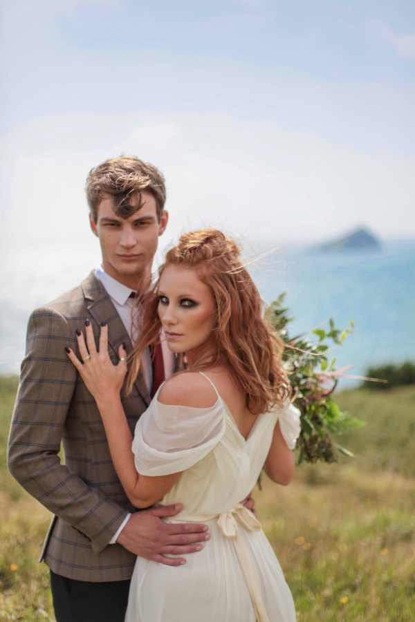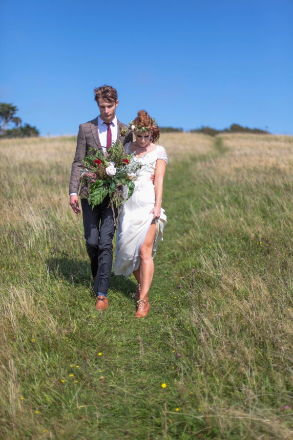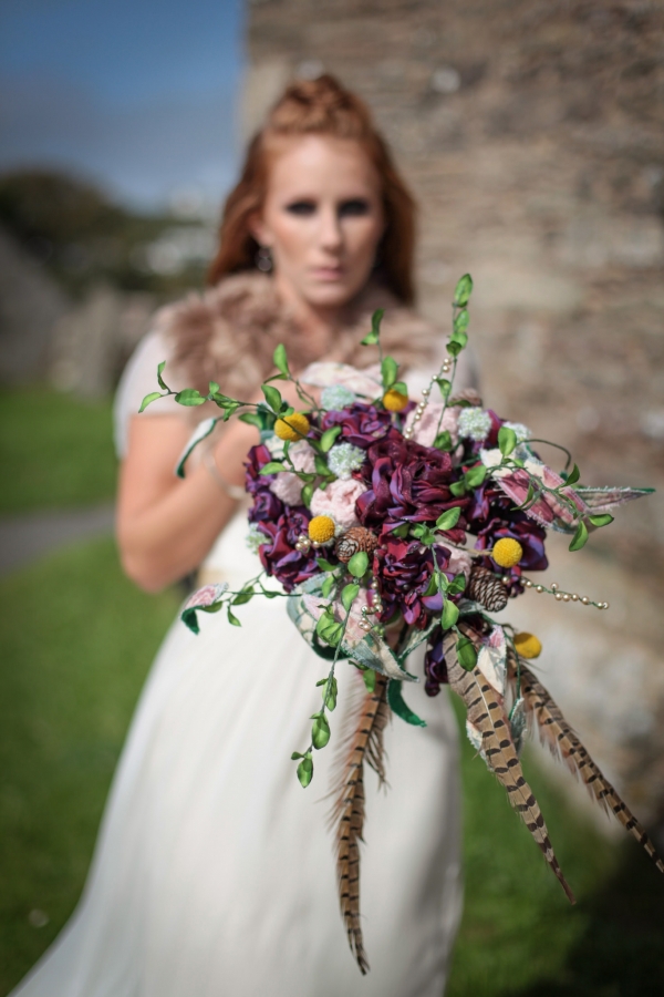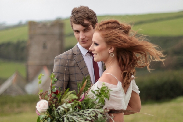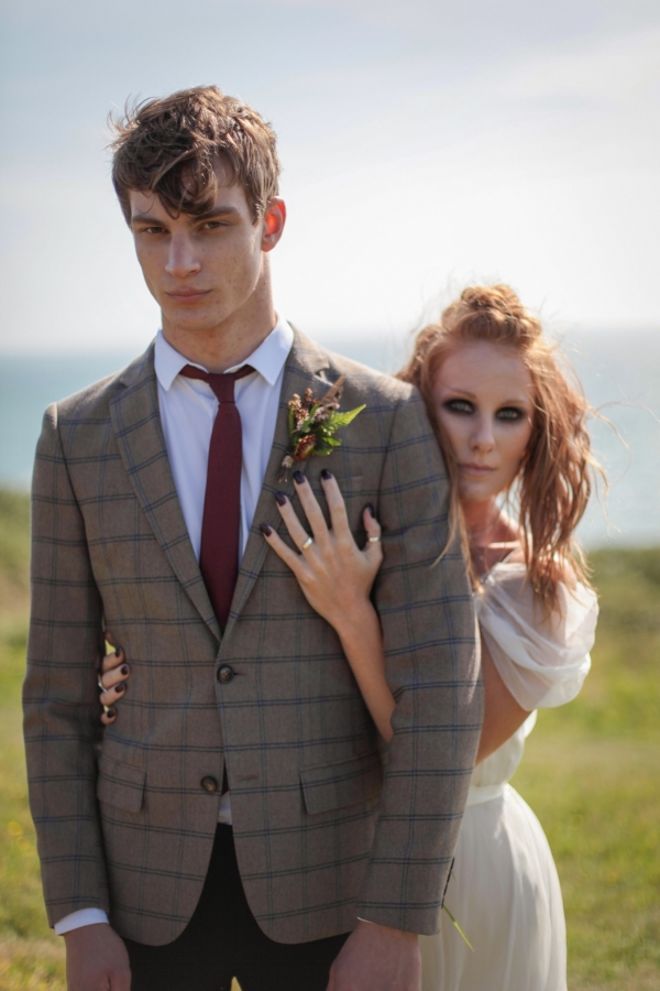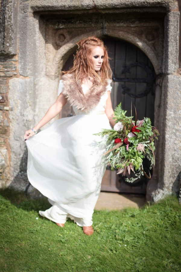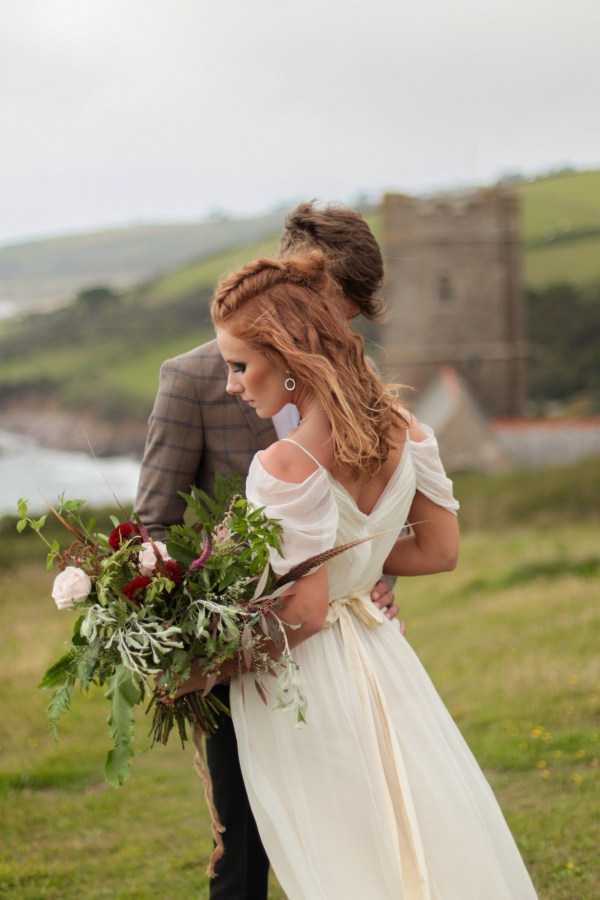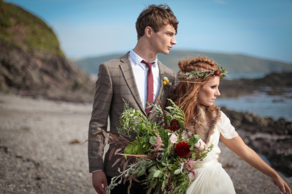 "This elopement styled shoot united my passion for everything bohemian with my total fascination for the Vikings' free spirit," says Mila. "The theme gave me inspiration to create a very fierce and romantic styled shoot with boots, red hair, Mohawk plats, wild bouquets with feathers, strong make-up, fur, a brown tweed suit and the amazing landscape of Wembury Devonshire coastline."