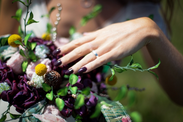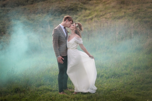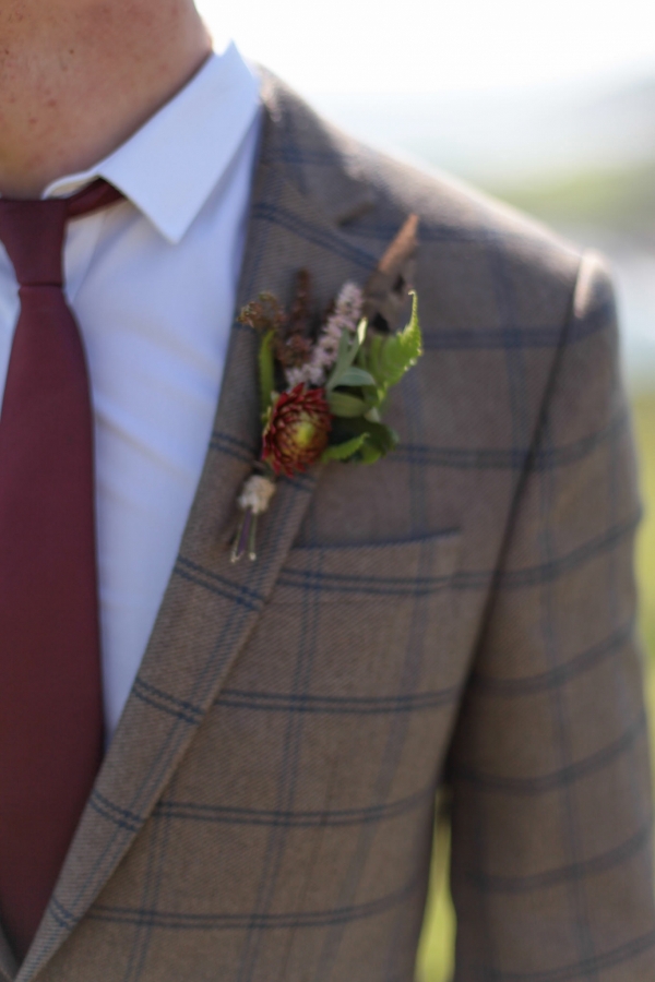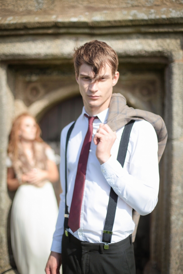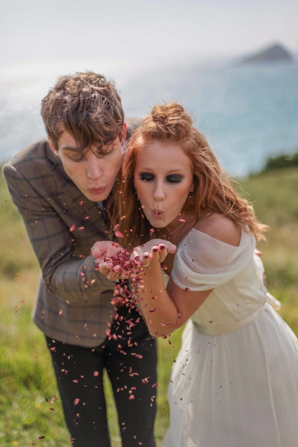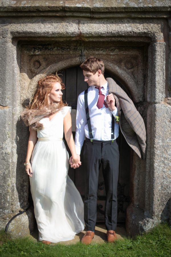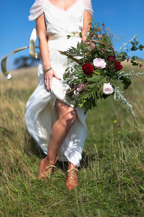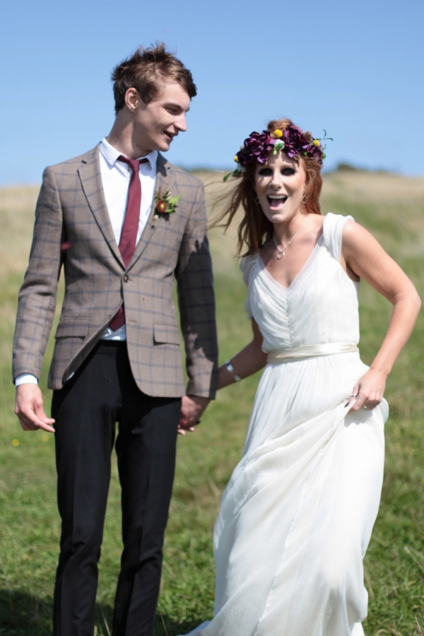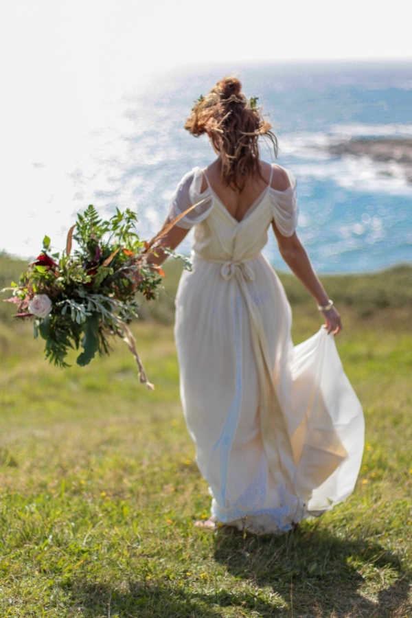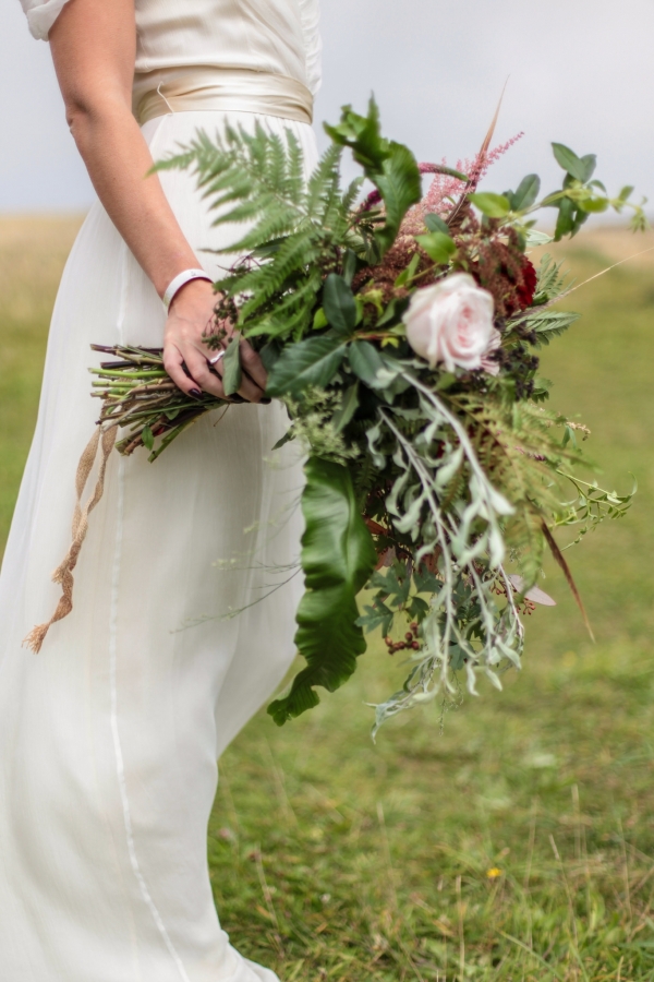"This elopement styled shoot united my passion for everything bohemian with my total fascination for the Vikings' free spirit," says Mila. "The theme gave me inspiration to create a very fierce and romantic styled shoot with boots, red hair, Mohawk plats, wild bouquets with feathers, strong make-up, fur, a brown tweed suit and the amazing landscape of Wembury Devonshire coastline."