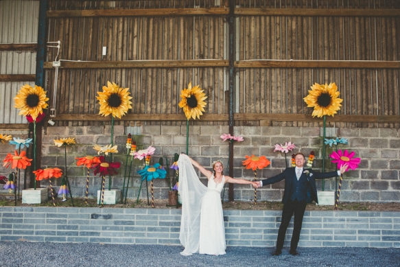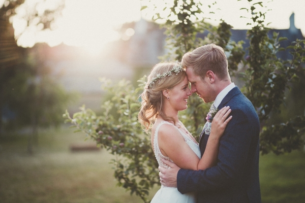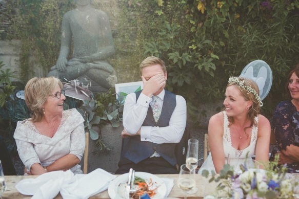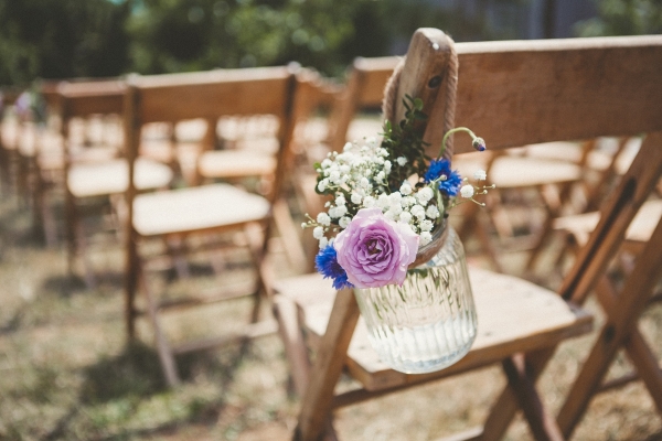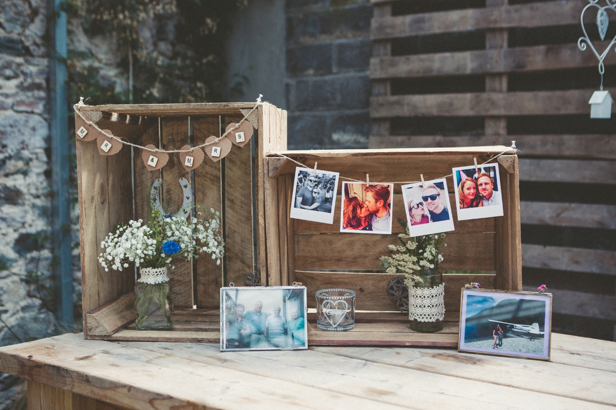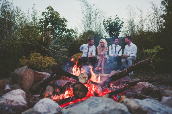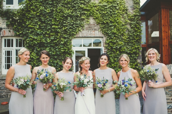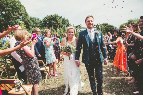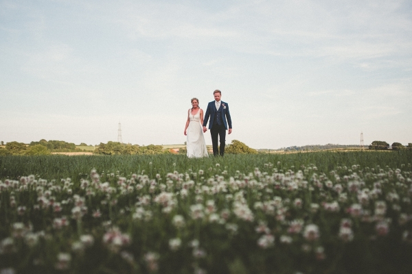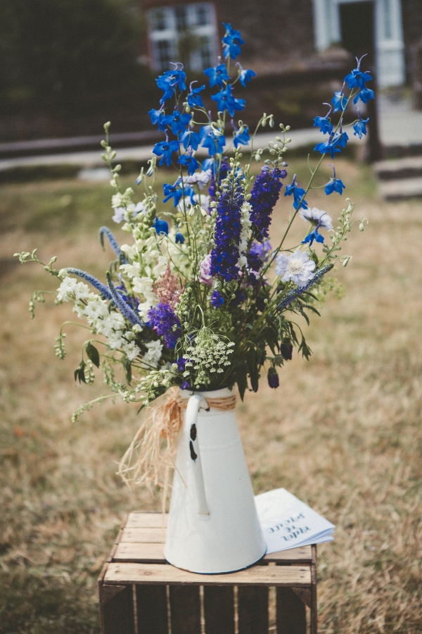 Her bridal look perfectly complemented the scene, a bohemian empire line gown featuring lace and a beautiful open back. Meanwhile, the groom and his groomsmen caused their own sartorial stir by donning dapper blue tweed lounge suits with Liberty print pastel wildflower ties.