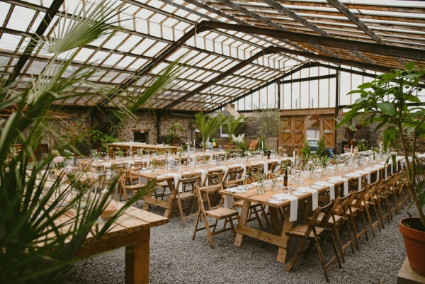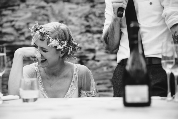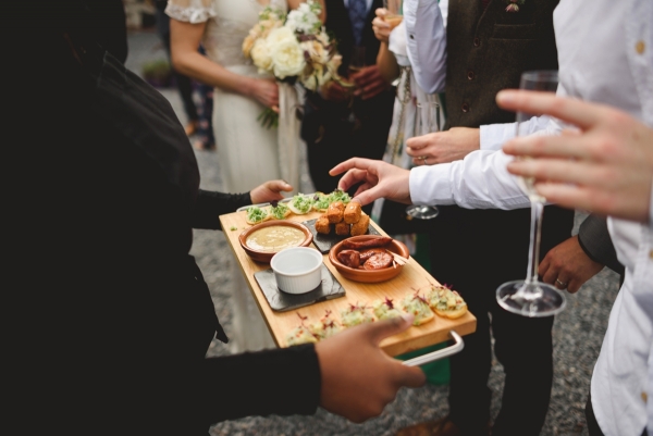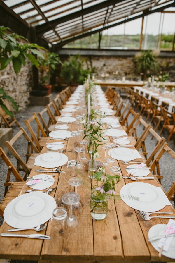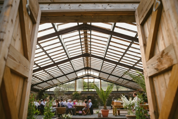 Following the church ceremony, guests walked to Anr�n in the sunshine, where they were met with bubbly and canapes in the courtyard and Dartmoor Kitchen's Devon Feast in the Glasshouse: a sharing-style spread including slow-cooked shoulder of lamb and a number of sides delivered to the centre of each table.