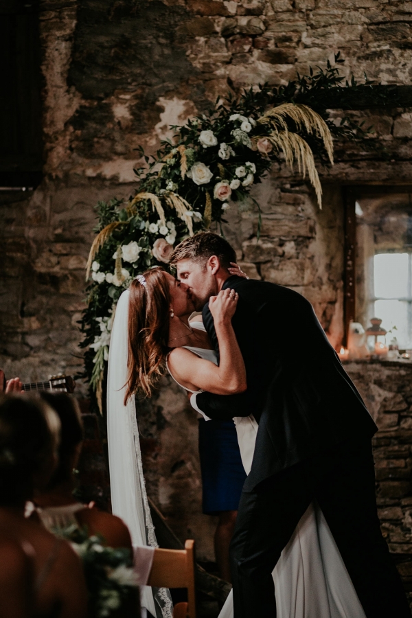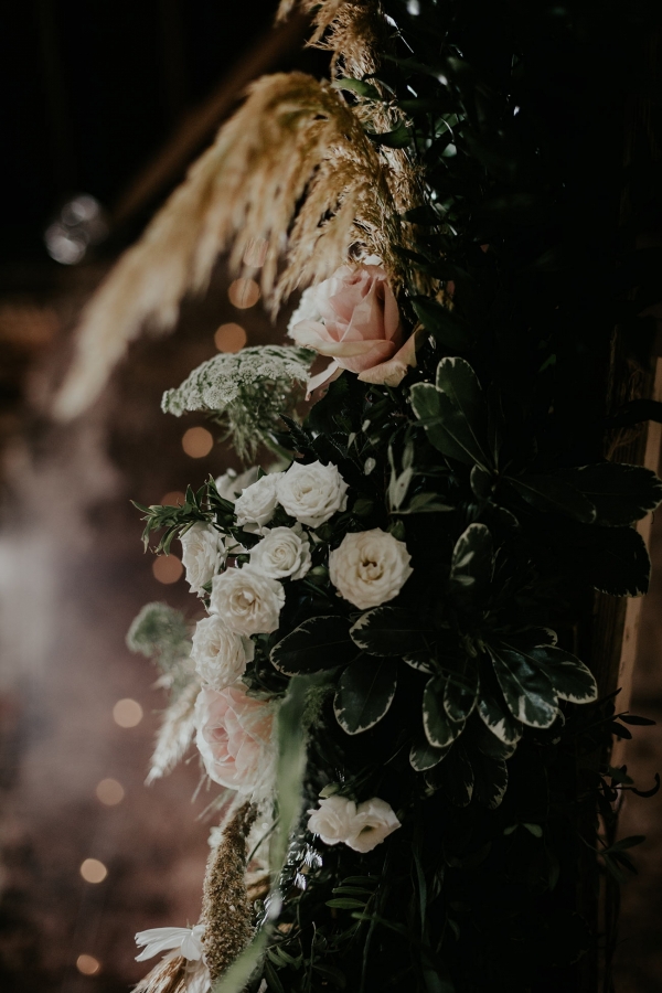 'The moon gate arch that was the backdrop to our ceremony was so beautiful I couldn't take my eyes off it,' says Lilly. 'In the barn, specially constructed hanging foliage hoops set the whole room off, and the tables were decorated with pampas grass, foliage and roses.' Bouquets of spray roses, garden roses and a mixture of textures completed the beautiful bloom-filled aesthetic while complementing Lilly's dress perfectly.