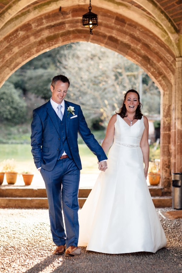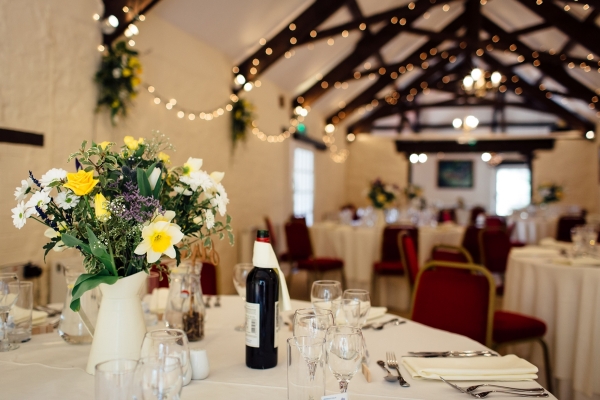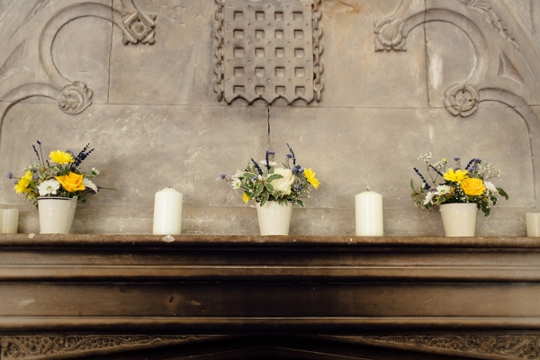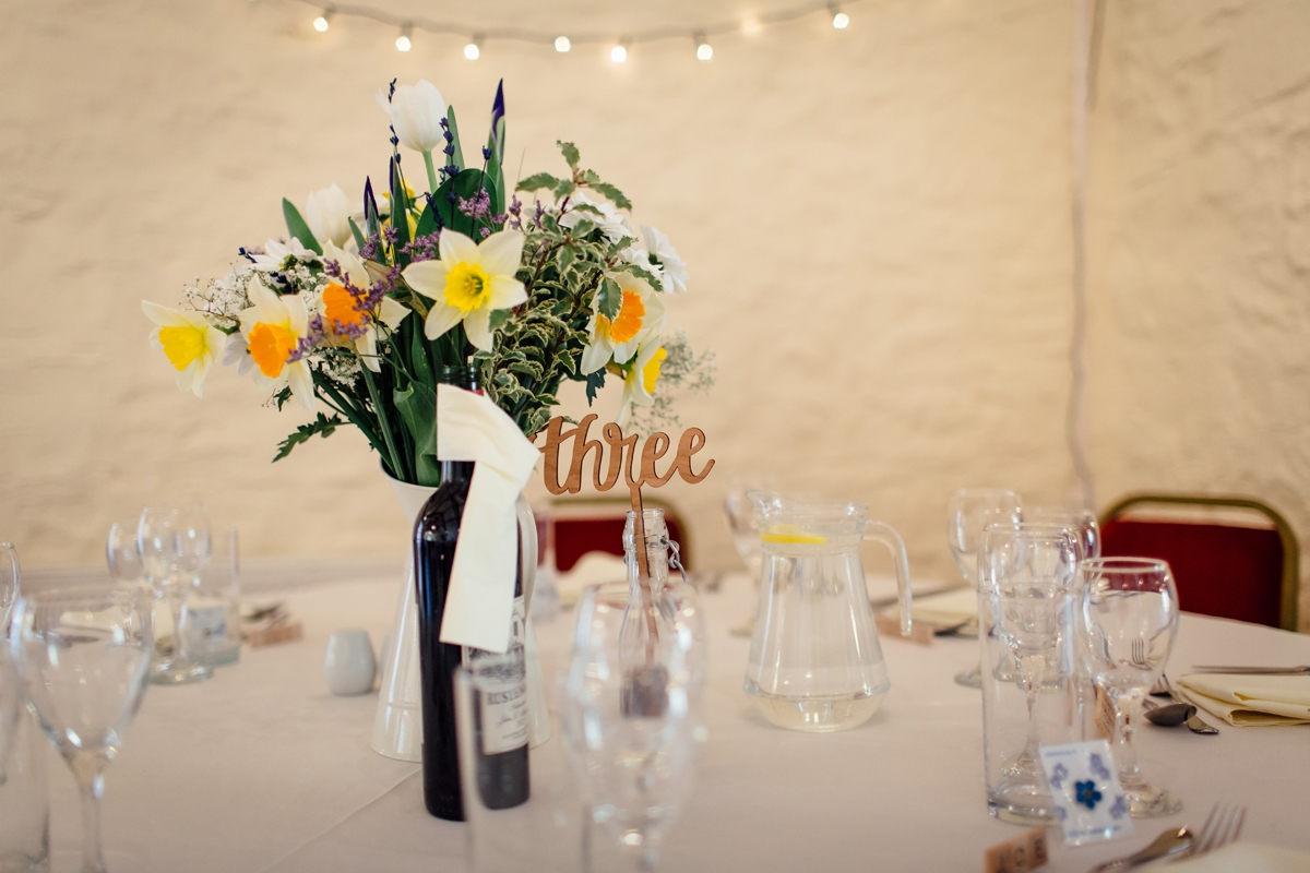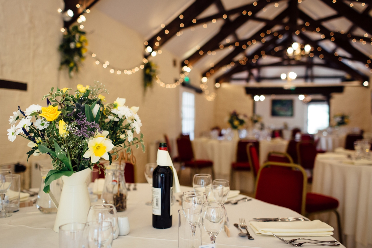 The couple, who live in South Africa, chose the fairytale setting of Bickleigh Castle as the setting for their nuptials. With a little help from Sharon, the in-house wedding planner, Tara and Tony's backdrop was formed. With flowers by Polly Thompson of West Country Wedding Flowers, the couple took advantage of all the beautiful spring colours. "Polly completely outdid all my expectations and the flowers blew me away," Tara says of the wonderful selection of white tulips, white and yellow roses, daffodils, thistles and baby's breath. "Polly recommended not adding anything to the already beautiful room, apart from swags of flowers along the wall and garlands of flowers around the pillars at the entrance. I was so thrilled I listened to her - the room looked breathtaking," she says.
