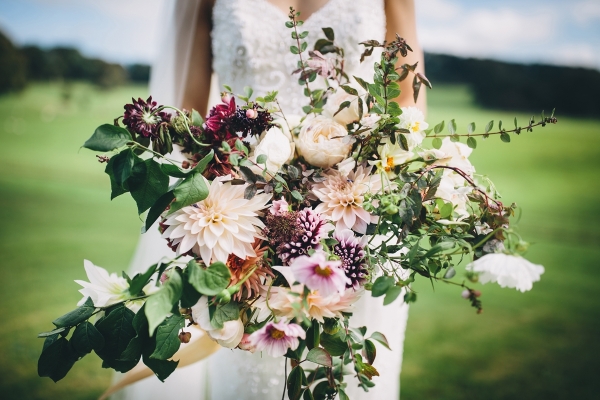 Opting for a gold, cream and purple "with a hint of James Bond!" wedding theme, the gorgeous floral arrangements were inspired by the colour scheme and time of year, balancing soft creams with warm autumn tones, berries, vining and seasonal foliage. Nick oozed 007 style in a sharp tuxedo, while Maddi looked the picture of elegance in a Maggie Sottero gown.