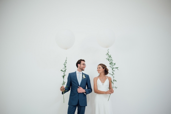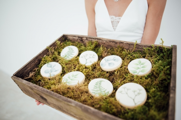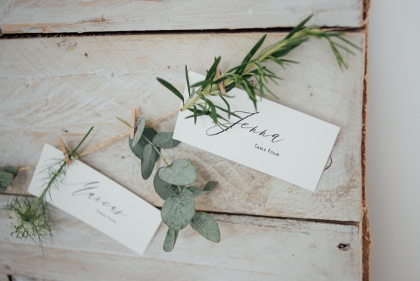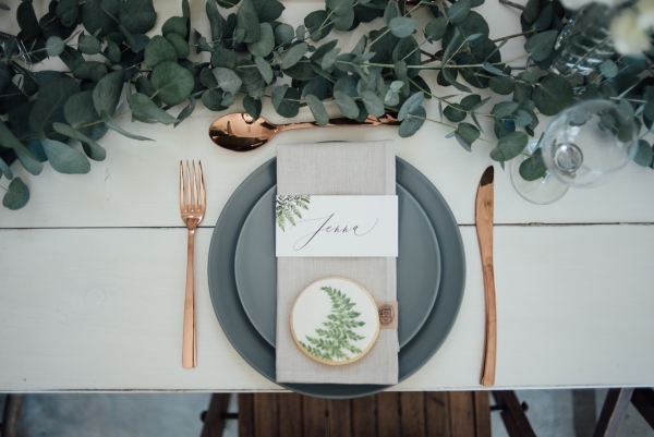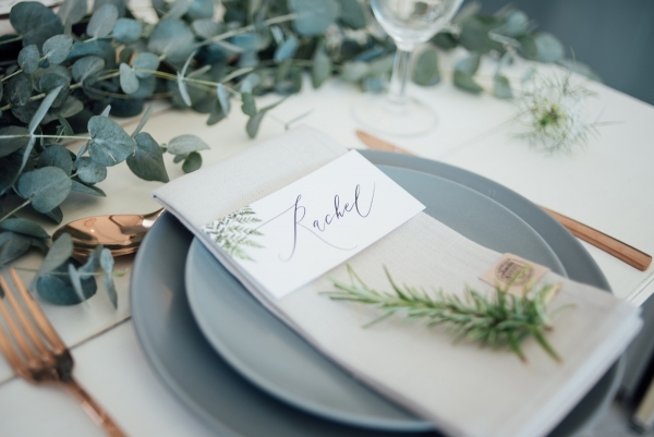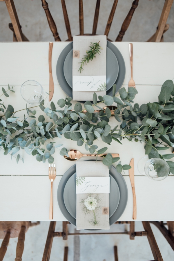 Green is the dominant hue, drawing the outside in while bringing lush colour to the white, minimalist interior. Table runners of eucalyptus and vases of dainty white flowers adorn the white vintage tables, while sprigs of rosemary and cornflowers create pretty table settings, which stand out against the grey tableware. A simple canopy of green branches above the tables highlights the height of the venue and its industrial elegance.