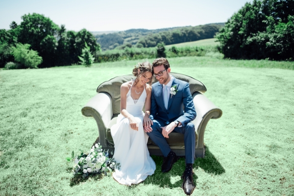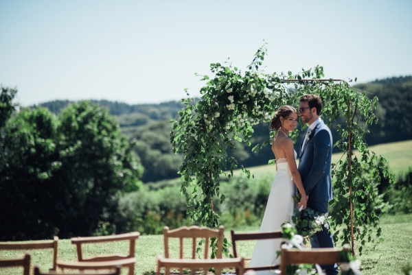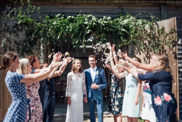 The botanical theme continues with an arch of beech leaves around the rustic barn doors, and carries through in the wedding stationery and stunning cake, with stencilled ferns and flowers creeping up the tiers of white icing. The champagne reception sits in the dappled light of a Sperry Tent, which comes as part of the wedding package, blending perfectly with the rustic style of the studio.