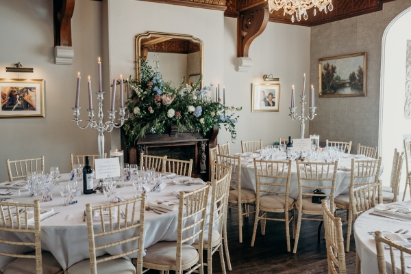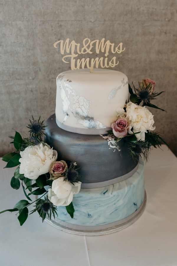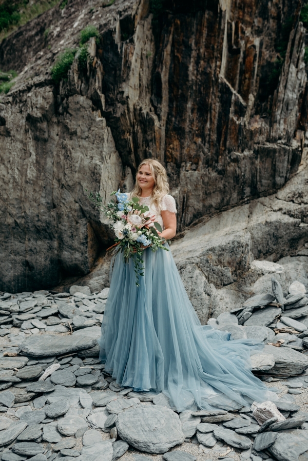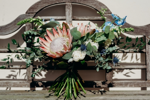 Florist Katie set about designing the day in earnest, with the blooms key to achieving their desired look, while also infusing new life into the venue. "Two days before the wedding, it was all hands on deck to get the flowers just right. I wanted a wild and natural theme with blue delphiniums and king proteas," she says.