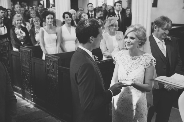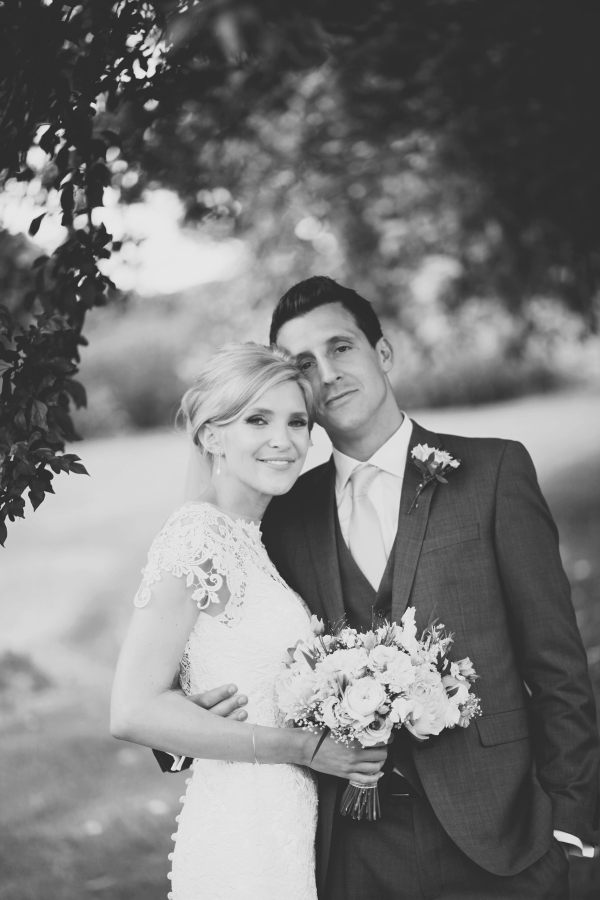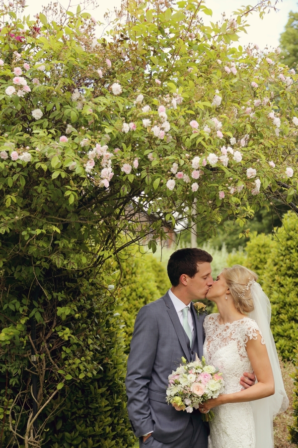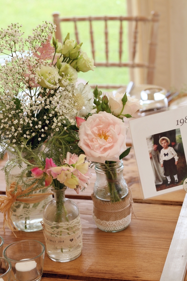 Envisioning a relaxed, country wedding in the heart of Devon, Emily chose a palette of white, pale green and pale pink shades. Gorgeous arrangements of gypsophila and David Austin pink roses beautifully set the scene, while milk churns filled with gypsophila adorned the entrance to the church and the marquee reception. "I decorated jam jars with lots of hessian and lace for the table flowers - including some lace that was Harry's great grandmother's," she says. Emily's lace gown by Sassi Holford - accessorised with a sparkly pair of Jimmy Choos - echoed the elegant country aesthetic perfectly.
