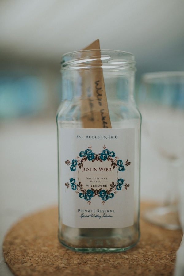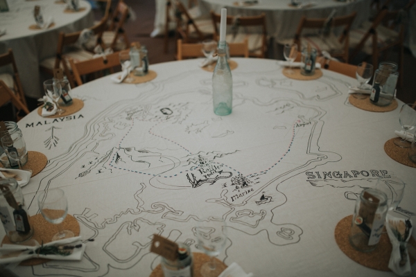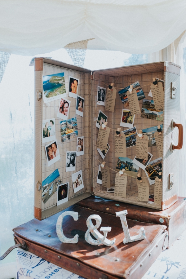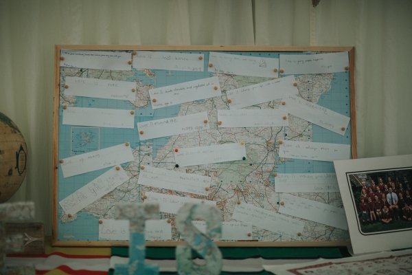 Named after pubs around the world that Claire and Lewis had visited or worked in, the tables were cloaked with Tolkien-style maps of their travels, hand drawn by Lewis's dad. "We made barrels of fun for each table, complete with a quiz, an eye spy, a personalised message and heads and tails box - lots to keep the guests amused!" says Claire.
