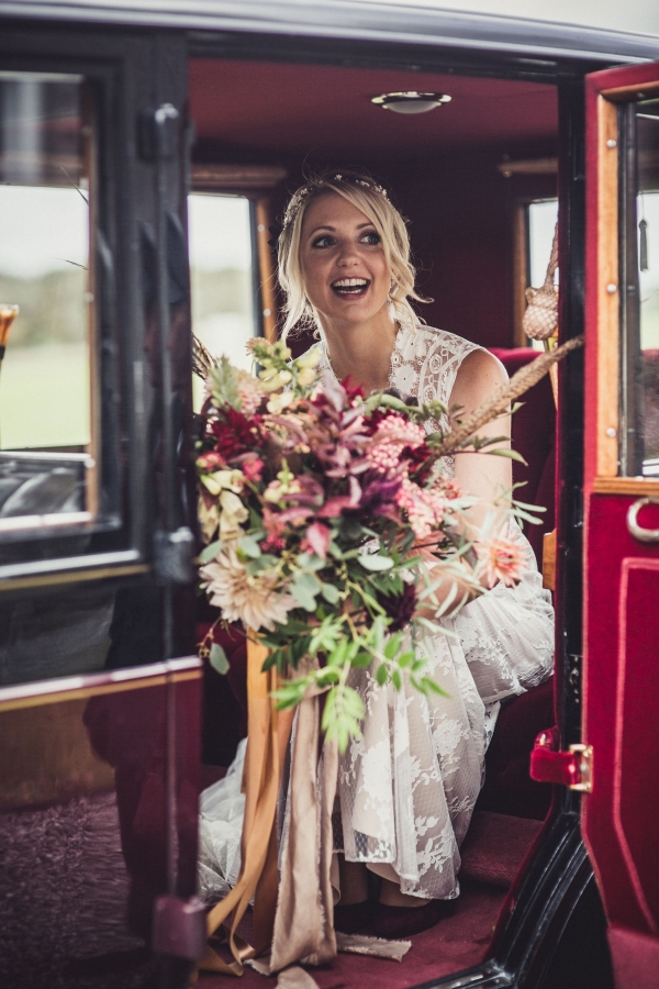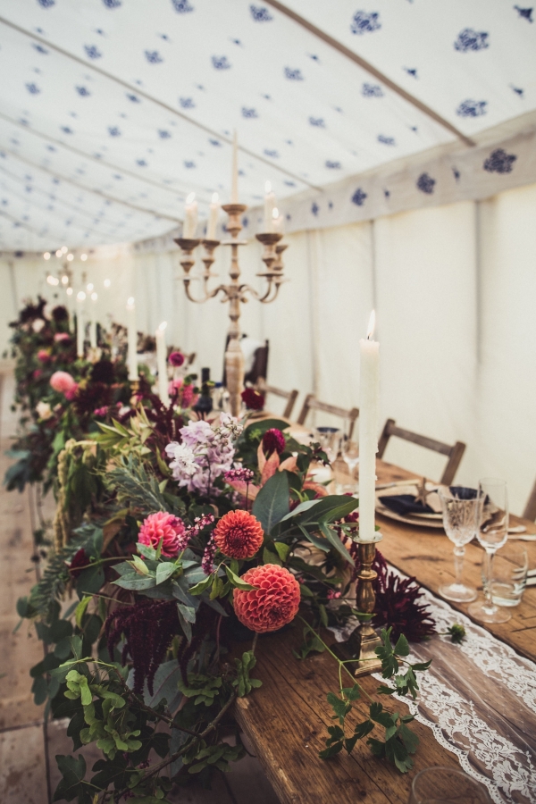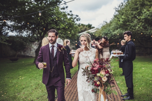 Creative designer Jessica created the rich-toned 'Autumnal Rustic Luxe' themed event, plumping for a dark and berry palette softened with neutral shades. "It quickly became known as our 'Gatsby in the Garden' wedding," she says. The sumptuous tones featured in many of the details, from the bridesmaids' nails and dark fur shawls to the claret bow ties and oversized bouquets. "We wanted the bouquets to look like they had been scooped up rather than precisely arranged," explains Jessica, who donned a stunning Claire Pettibone gown which complemented the rich, romantic aesthetic of Ash's claret Burberry suit.