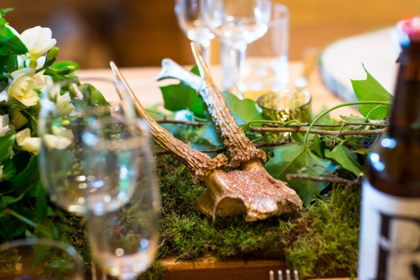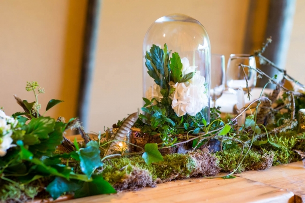 Hendra Barns provided the perfect setting, with tipis styled in a natural colour scheme of greens and whites with a "magical edge" achieved by gold accents. Moss, bell jars, fairy lights and framed photos from their engagement night featured alongside accessories such as skulls, dreamcatchers and antlers to make for spellbinding decor.