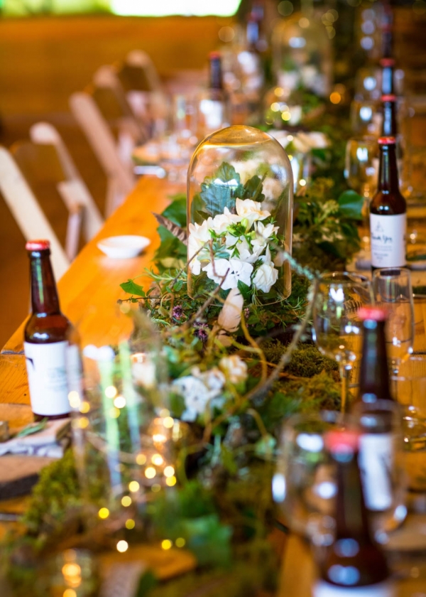 Jessie and Tamsin enjoyed a private reveal ahead of the ambient woodland ceremony, which was followed by drinks and canapes in the barns before the newly-weds briefly disappeared for photos in the tipis and by the lake. The Round Kitchen served up a sumptuous vegan, gluten-free feast, which also featured fish and vegetarian options. "All the guests remembered the home-cured salmon sushi rice ball canapes, and the foil-baked butterflied mackerel went down a storm. Plus, meateaters and vegans alike enjoyed the hearty baked butternut squash," says Tamsin. All the drinks, including several tasty craft beers, were provided by Welsh microbrewery Tiny Rebel.