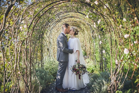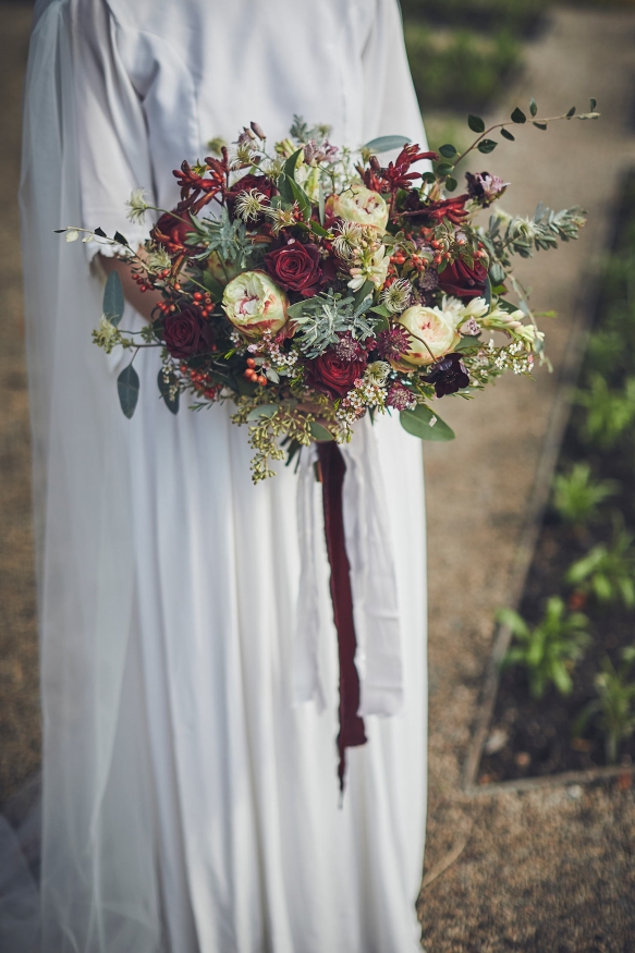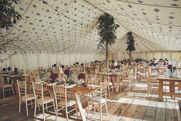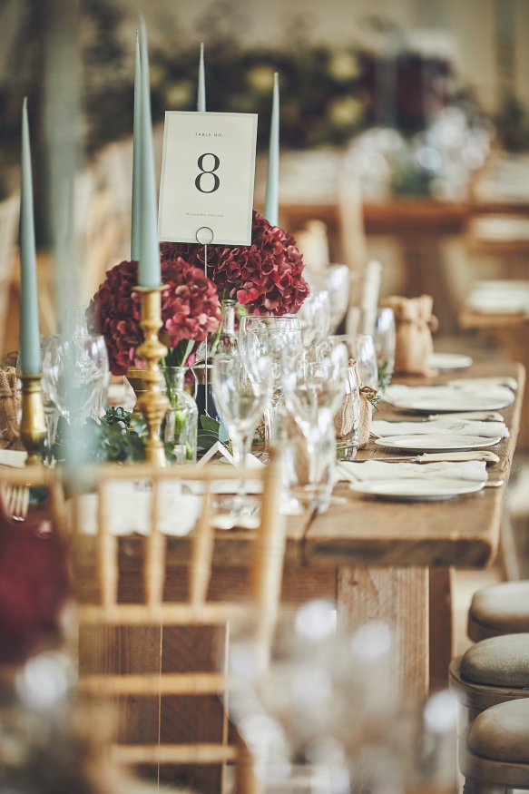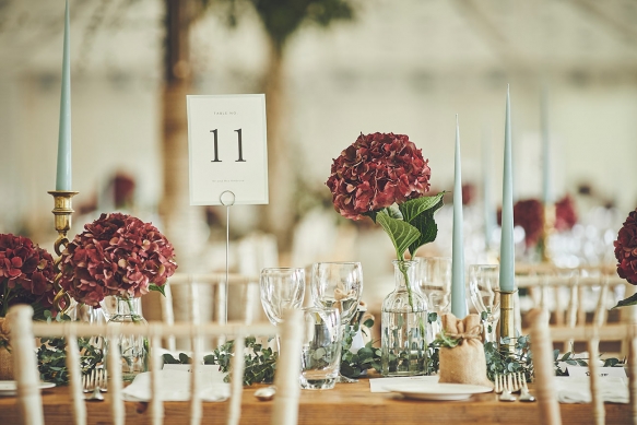 Taking a colour scheme of deep burgundy, pale pink and sage green, a smattering of candles and lanterns adorned the marquee, which was left pared-back and rustic to allow the floristry to take centre stage. Hydrangeas on the tables infused a burst of colour and were complemented by foliage from Endsleigh's gardens wrapped around the marquee's supporting poles, while a moon gate created a fabulous focal point for the ceremony in the stable.