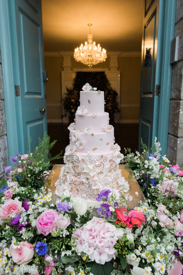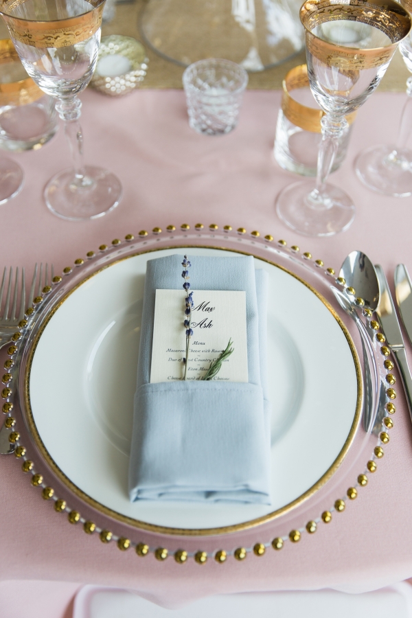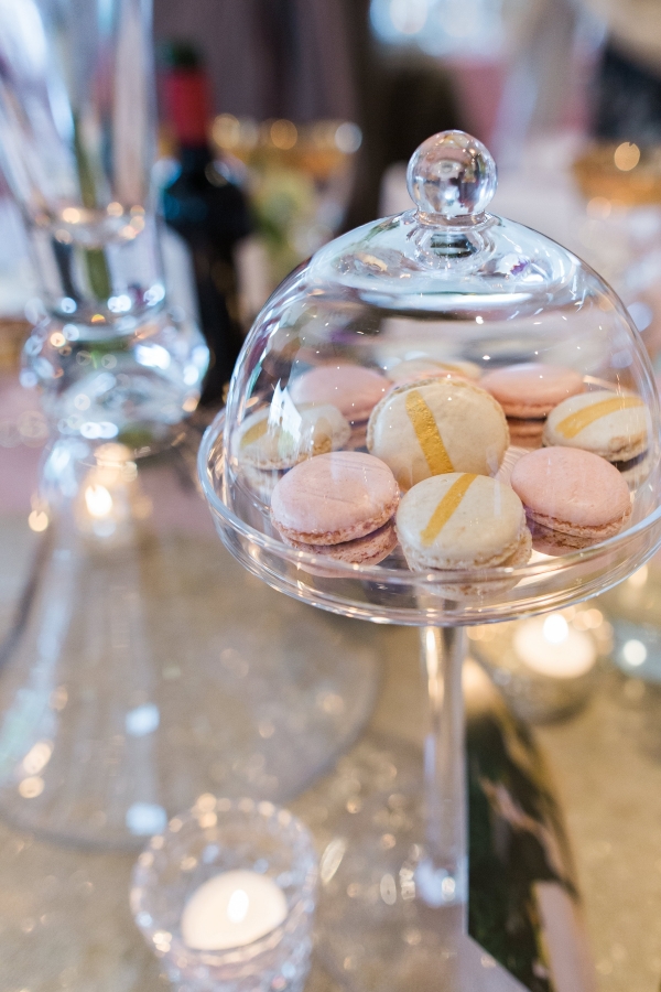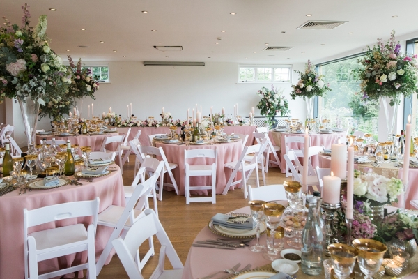 The beautifully styled reception space featured a luxe colour scheme of pink and gold, evoked via stunning floral arrangements, gold-rimmed plates and glassware, glittering table runners and a multitude of glinting candlesticks and tea lights.