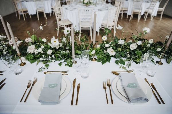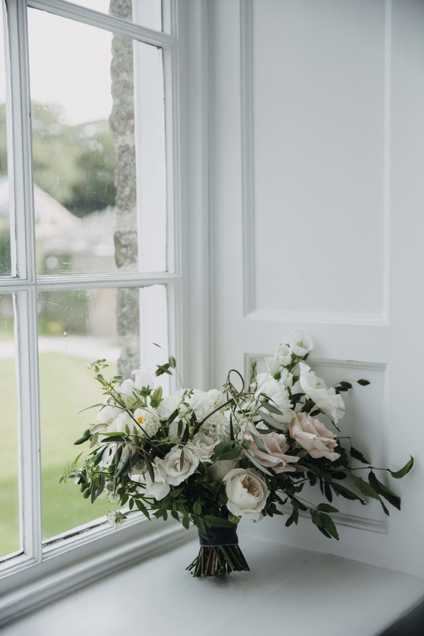 Opting for a natural, pared-back colour scheme for their celebrations in the beautiful setting of Launcells Barton, a mix of white, green, grey and gold with some soft pink touches was carried in everything from the bridesmaids' dresses to the decor, including gorgeous sea glass pieces as table names that doubled as wedding favours.