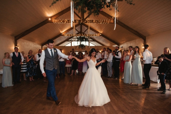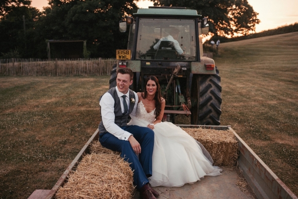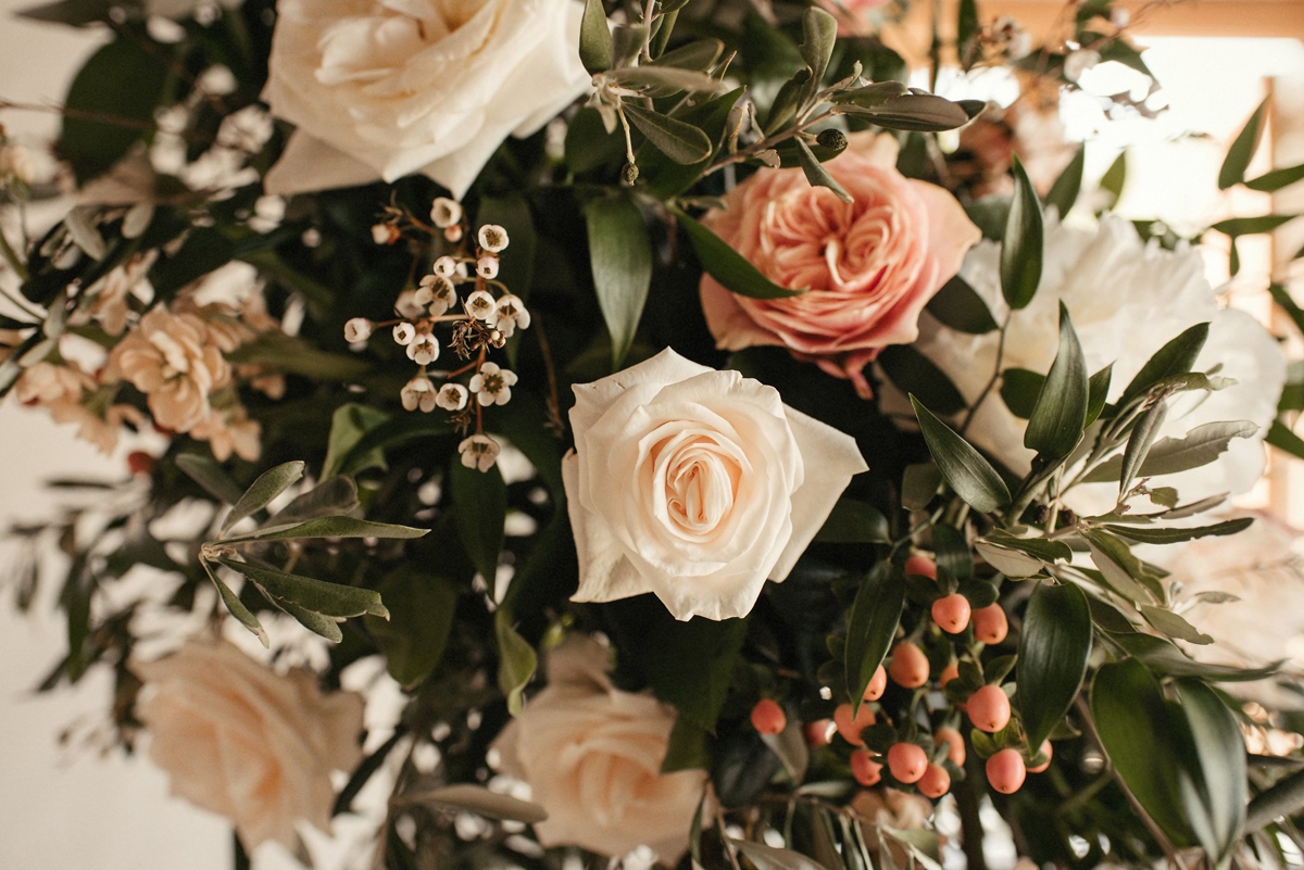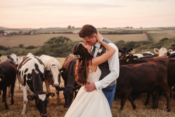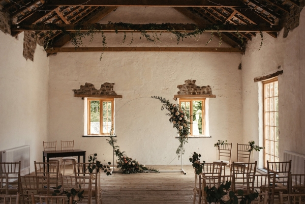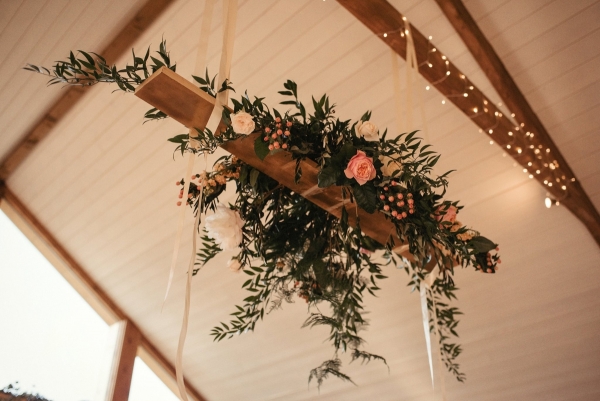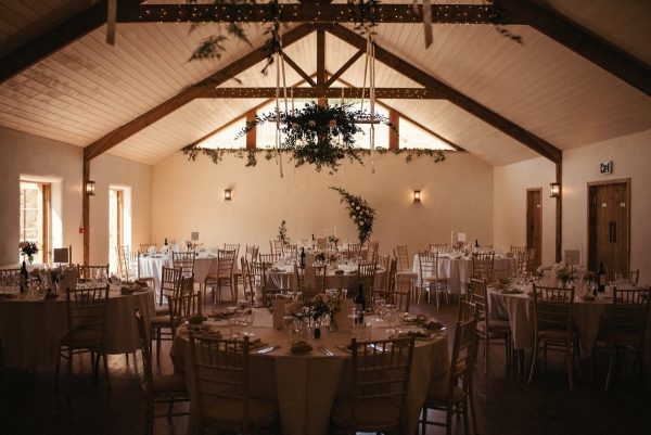 The wow factor flowers didn't end there. Erica of Bleujen also created a spectacular floral arch and wove foliage into the lighting of the ceremony barn, filled milk churns from the farm with flowers, and set up incredible hanging floral designs in the reception barn.