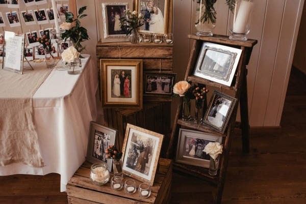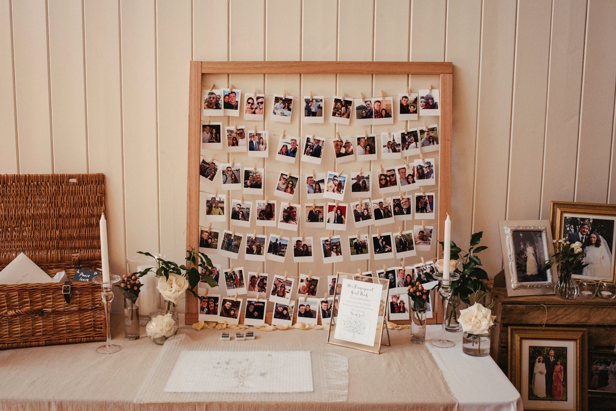 'We set up a table in the entrance with wooden crates and a stepladder dressed with family wedding photos, flowers and candles and also a photo board displaying photos from throughout our relationship. In the same place we left a fingerprint tree we bought last minute for guests to make their mark, which tied into our table names. It looks brilliant and is such a lovely reminder of the day framed on our wall at home,' adds Mary-Anne.