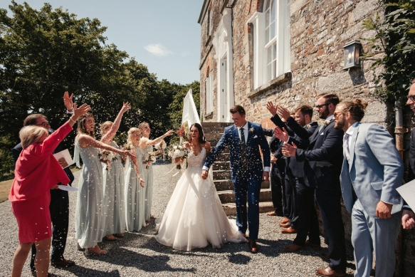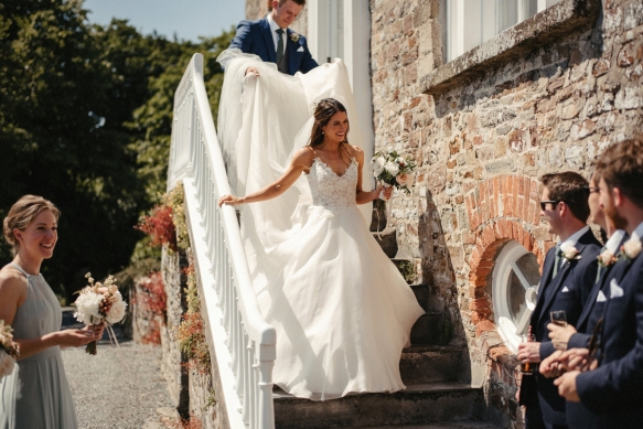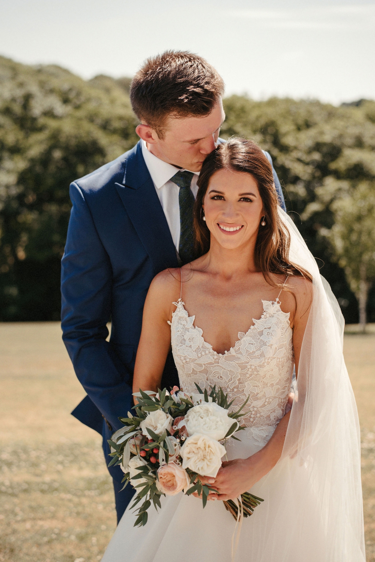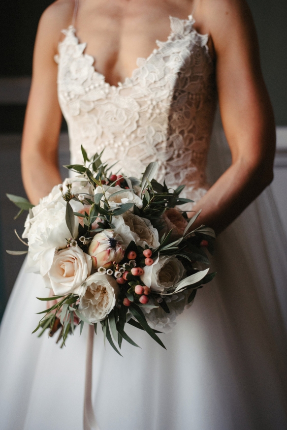 The floristry was another key component of the day's aesthetic, comprising rustic-style flowers with lots of greenery and proteas in Mary-Anne's bouquet to reflect her South African heritage, with soft colours to complement the nude blush undertone of her bodice alongside pops of coral.