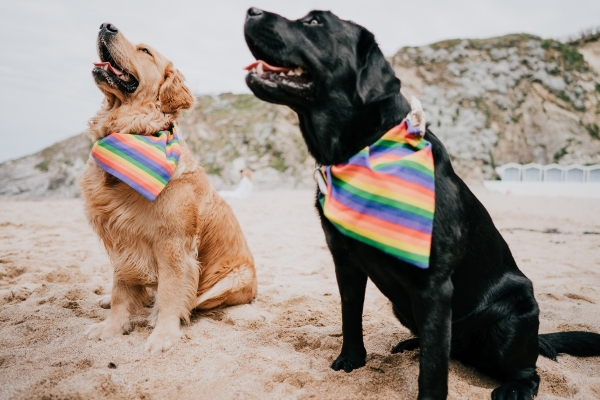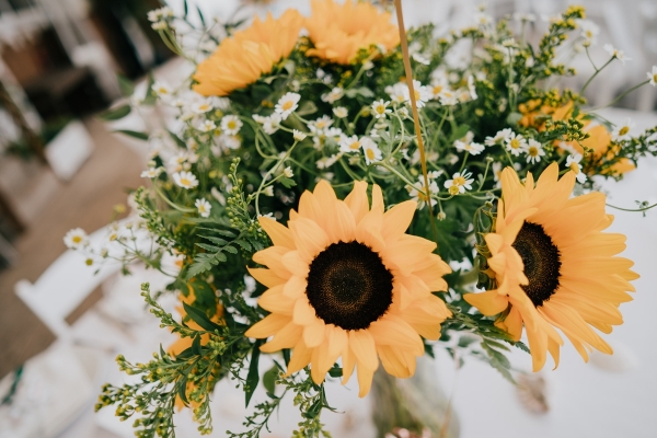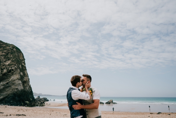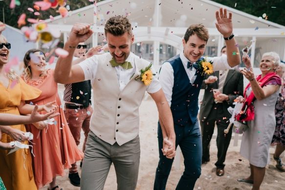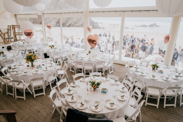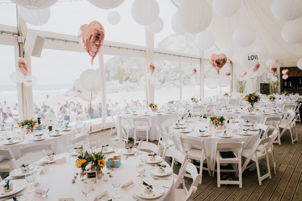 Continuing the seaside theme, the couple chose Lusty Glaze as the venue for their wedding, which adopted an uber-relaxed mood complete with rose gold and rainbow tones. Sunflowers were the perfect bloom to decorate the waterside venue, which were arranged as a wedding gift by their florist cousin, Clare, to enhance Lusty Glaze's sun-spilled space.