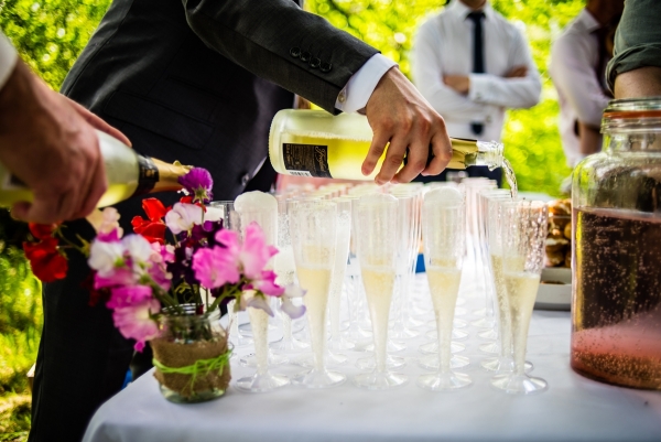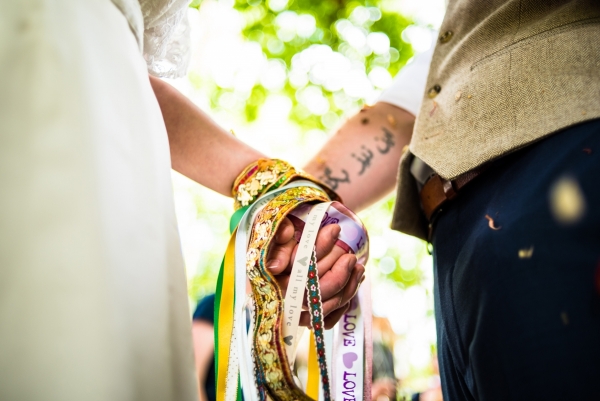 Legally married on-site in the Cider Barn, the pair then led their guests to another magical location for one of their favourite moments of the day. "We each took a jar of flowers and had a procession up the hill to the woodland for the hand tying ceremony, placing them at the base of the 500-year old oak," says Rachael.