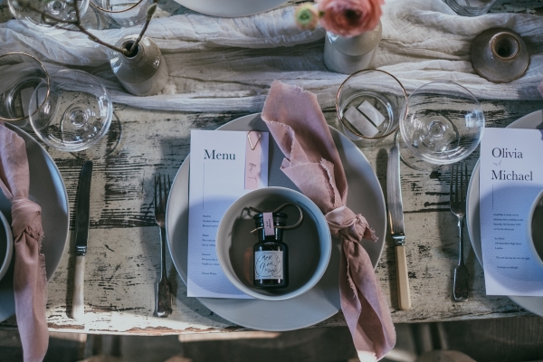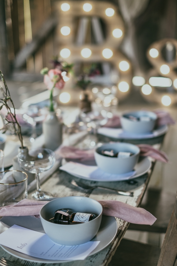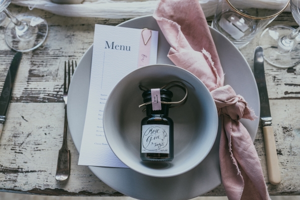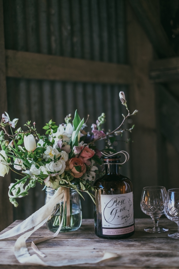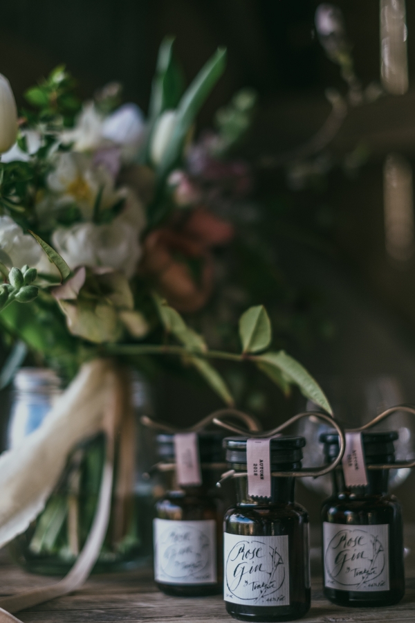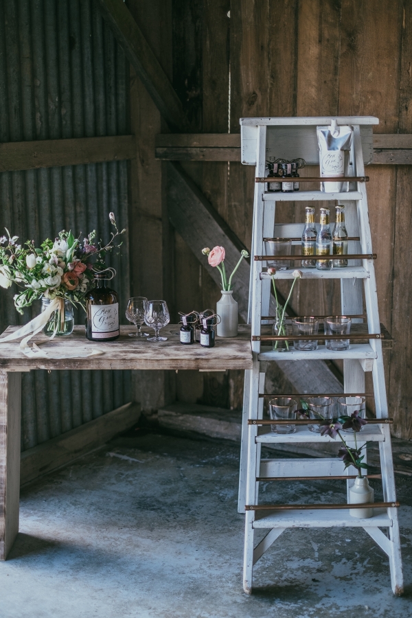 Then there's the tabletops. Delicate arrangements of muted tableware and stems of flowers are flanked by gorgeous favours of mini bottles of Tinkture gin that can be found in abundance on the gloriously rustic gin bar flanked by a vintage step ladder.