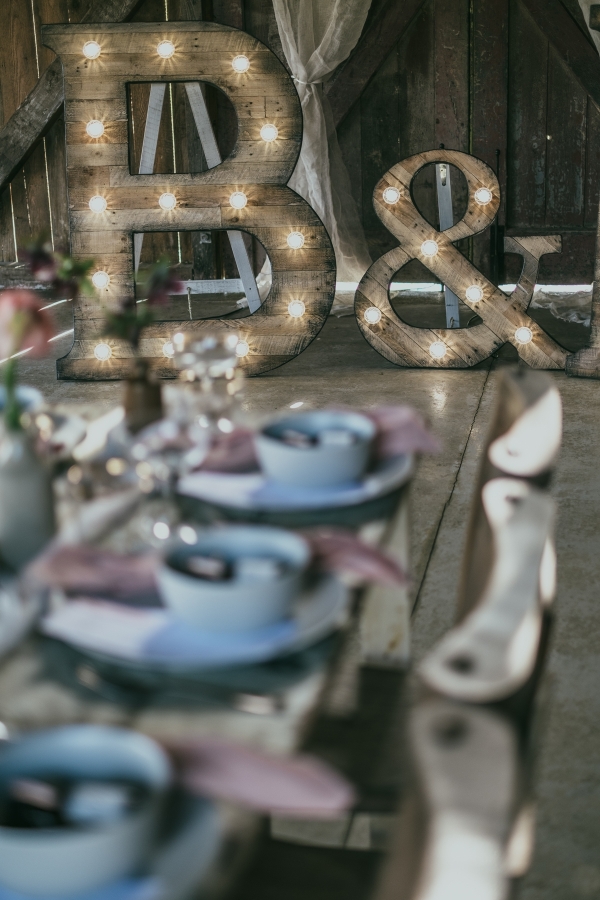 Throw into the mix a series of light-up love letters, a rustic-chic table plan and bar, and the eye-catching aesthetic is complete. Supplied by The Wedding Co,