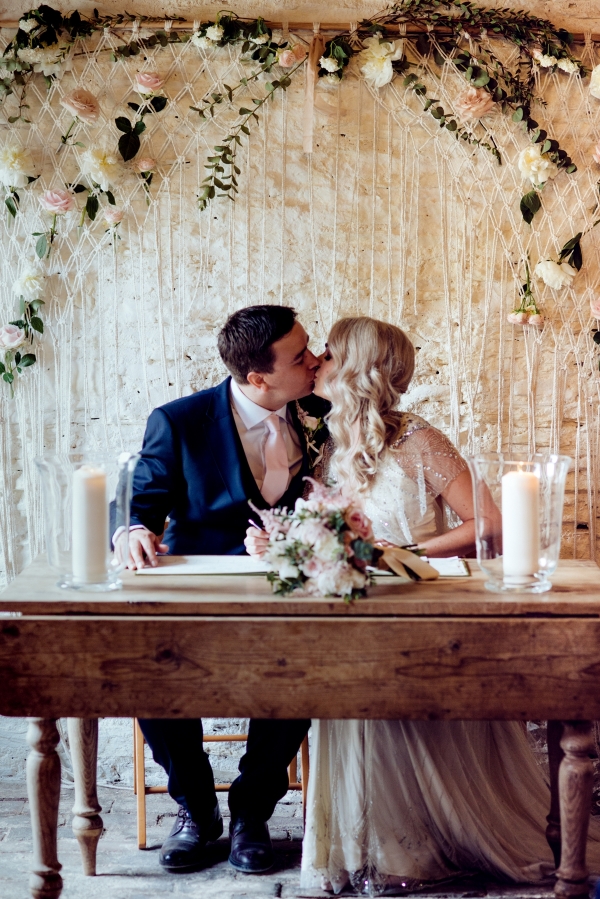Following the ceremony, canapes were served with Prosecco, Pimm's and beers in the courtyard, after which guests relocated to the lower barn for the newly-weds' joint speech and wedding breakfast. Sharing boards whetted appetites for a sumptuous main course of chicken breast 'poach grill' asparagus, wood mushroom truffle, and slow-braised ox cheek.