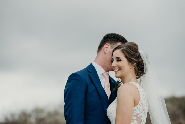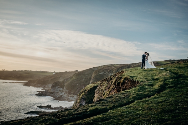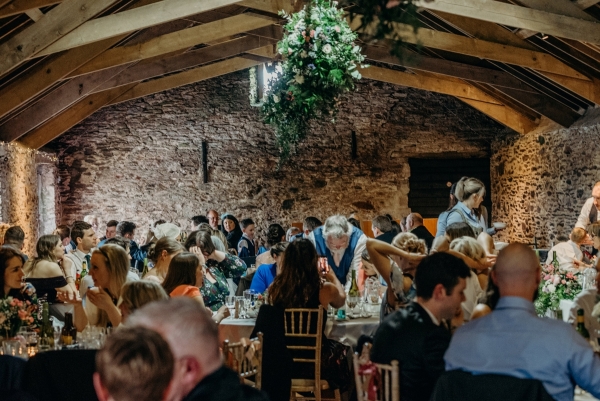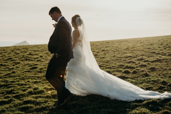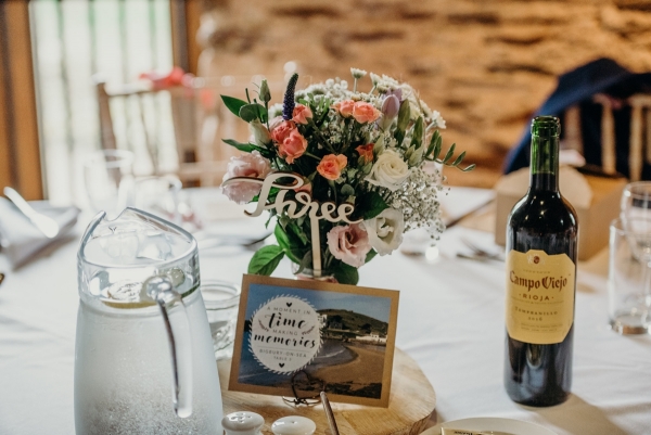 "When we emerged from the church, the sun began to shine down on us, and after having some photographs on the cliffs we headed for New Barton Barns for welcome drinks and canapes," says Hayley. A relaxed, "natural" theme led the decor and styling, with milk churns full of flowers and large hanging floral displays.