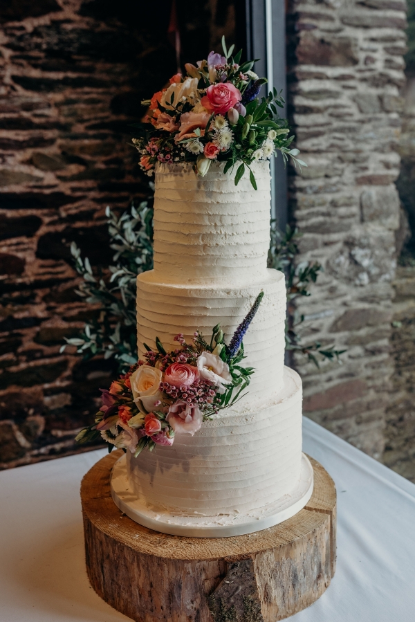 Choosing to do the speeches straight away - "so that all nerves could be settled and the wedding breakfast fully appreciated!" - the guests tucked into roast beef, chicken wrapped in parma ham and goat's cheese tart, followed by white chocolate and raspberry cheesecake and chocolate brownies. An impressive buttercream ruffle cake comprising three delicious flavours was adorned with fresh flowers.