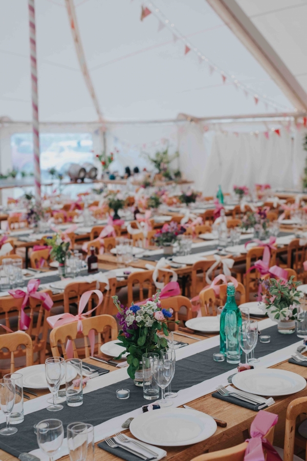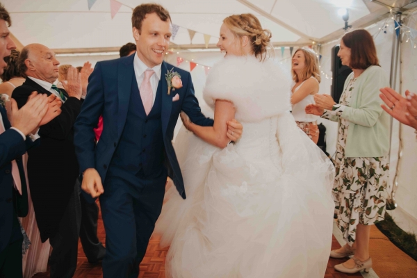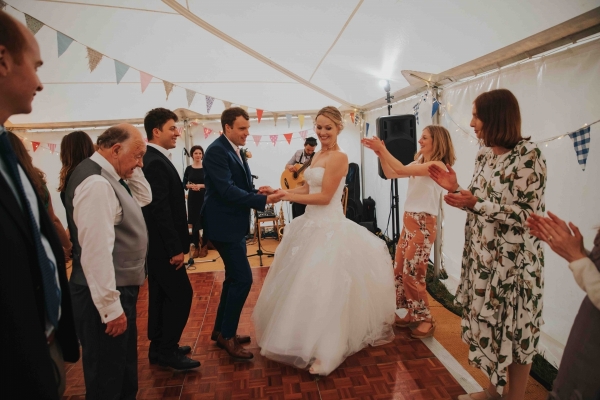 Warming up with a cream tea served on mismatched vintage china at Newdowns Farm, the marquee reception continued with speeches and cutting the cake made by Emily's mum, before sitting down for dinner. The feast included Cornish smoked mackerel, spatchcock chicken grilled over charcoal, and almond chocolate cake with clotted cream and soft fruits for pudding. "Woodfired Weddings cooked everything over charcoal and we were hoping to have the fires out in front of the marquee, but it was so windy and wet they had to shelter behind it," says Emily. "I'm not sure many people realised that everything was cooked outside!"