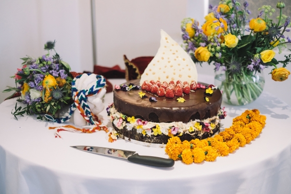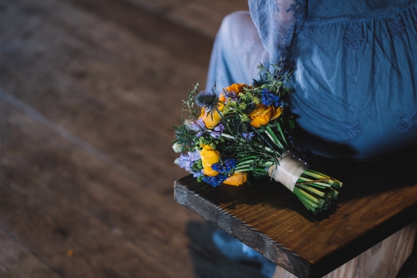 A flower-inspired palette of blues, oranges and dark green evoked visions of bluebells, for British spring, and marigolds, significant in Indian celebrations, while George Mackay's hand-picked and homegrown floristry added a beautifully rustic touch.