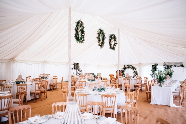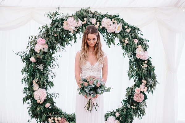"The large floral arch was something I wanted from the beginning," says Katy. "The idea was for it to be a focal point and people could take photos standing in the middle of it. With the beautiful waterside backdrop, it was a really special feature and was mirrored with the three large, circular floral installations hanging from the roof of the marquee."