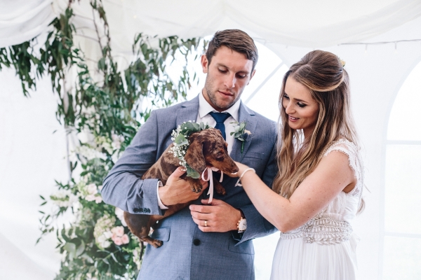 "Our miniature dappled Dachsund Luna joined us for an hour in the marquee," recalls Katy of an especially fond memory. "Elle from Inspire Hire made her a floral collar. She was very excited by all the people there, and was happy as long as someone was throwing a ball for her!"