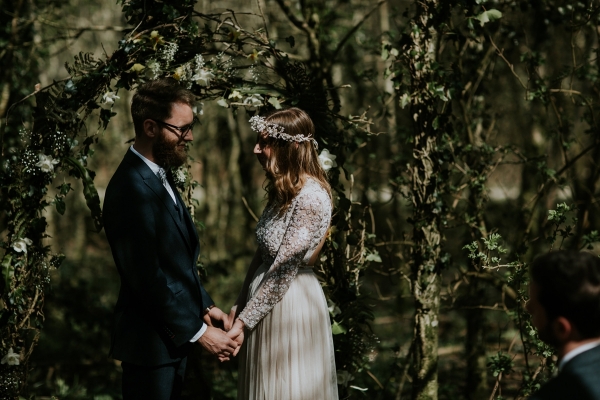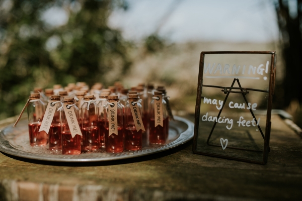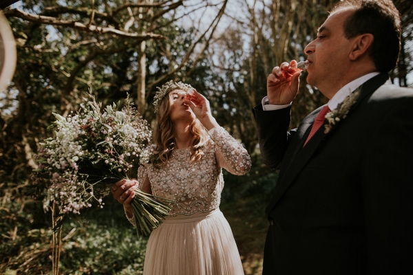 Being driven to the ceremony by the best man in her own decorated Mini, Sarah arrived to see the sun streaming through the trees. "The guests walked through the woods where they found a tray of shots halfway up!"