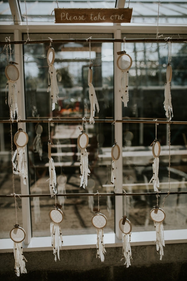 Settling on a relaxed, bohemian, woodland vibe, Sarah and Jamie set to work making a lot of the decor for their wedding. "Jamie made the signs out of wooden pallets and I painted the calligraphy," says Sarah. "We made home-made candles using old jars and Jamie also made the framework for the ceremony arch, which was later decorated with wild flowers by Jamie's brother. My sister made dreamcatchers, which were hung around the woods, and smaller ones that we gave as favours. We then used bunting and fairy lights, and decorated the tables with gypsophila and lavender in different sized jars. I loved that my bouquet was personalised to include flowers for different purposes, such as lavender to soothe any anxiety when walking down the aisle."